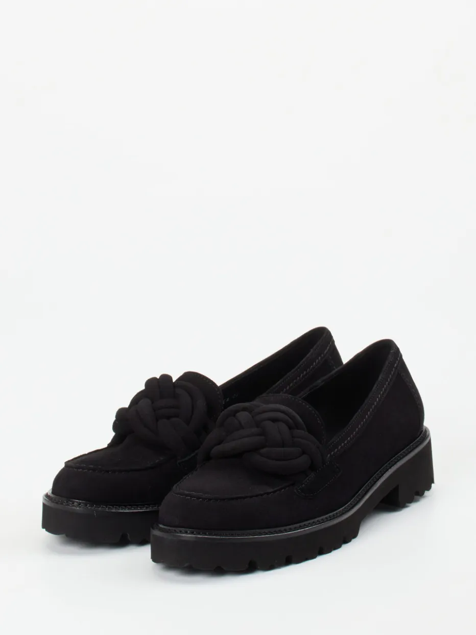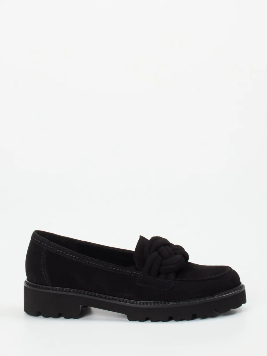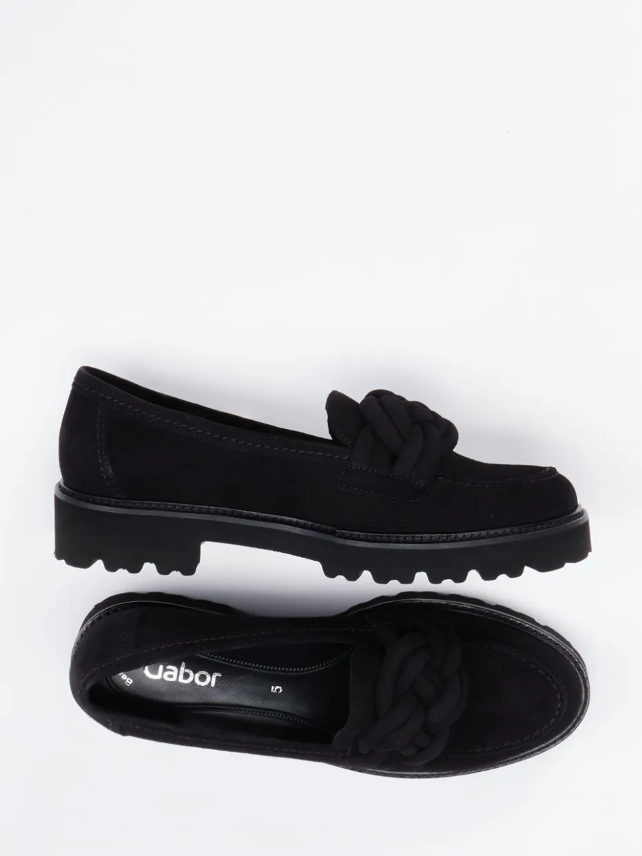 Minimalismus trifft Statement-Detail.Gabor präsentiert diesen stilvollen Damen-Loafer der Kategorie Chunky Halbschuhe. Ideal für den vielseitigen Alltag mit modischem Anspruch: Der schwarze Loafer aus hochwertigem Veloursleder zeigt sich mit matter Oberfläche und tonalen Nähten. Eine kunstvoll geflochtene Knoten-Verzierung setzt einen dezenten Blickfang auf dem Blatt. Die klassische Schlupfform und die voluminöse, strukturierte Profilsohle sorgen für angenehmen Laufkomfort – ob im Büro oder unterwegs in der Stadt. Der Look passt besonders zu minimalistischer Garderobe oder als Akzent zu Strickkleidern. Moderner Komfort mit trendorientierter Silhouette – Gabor-typische Qualität inklusive.