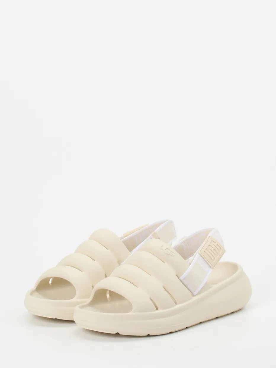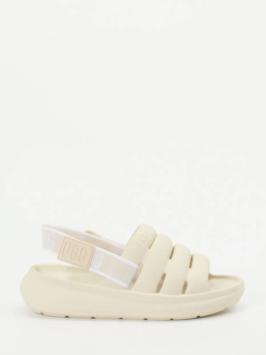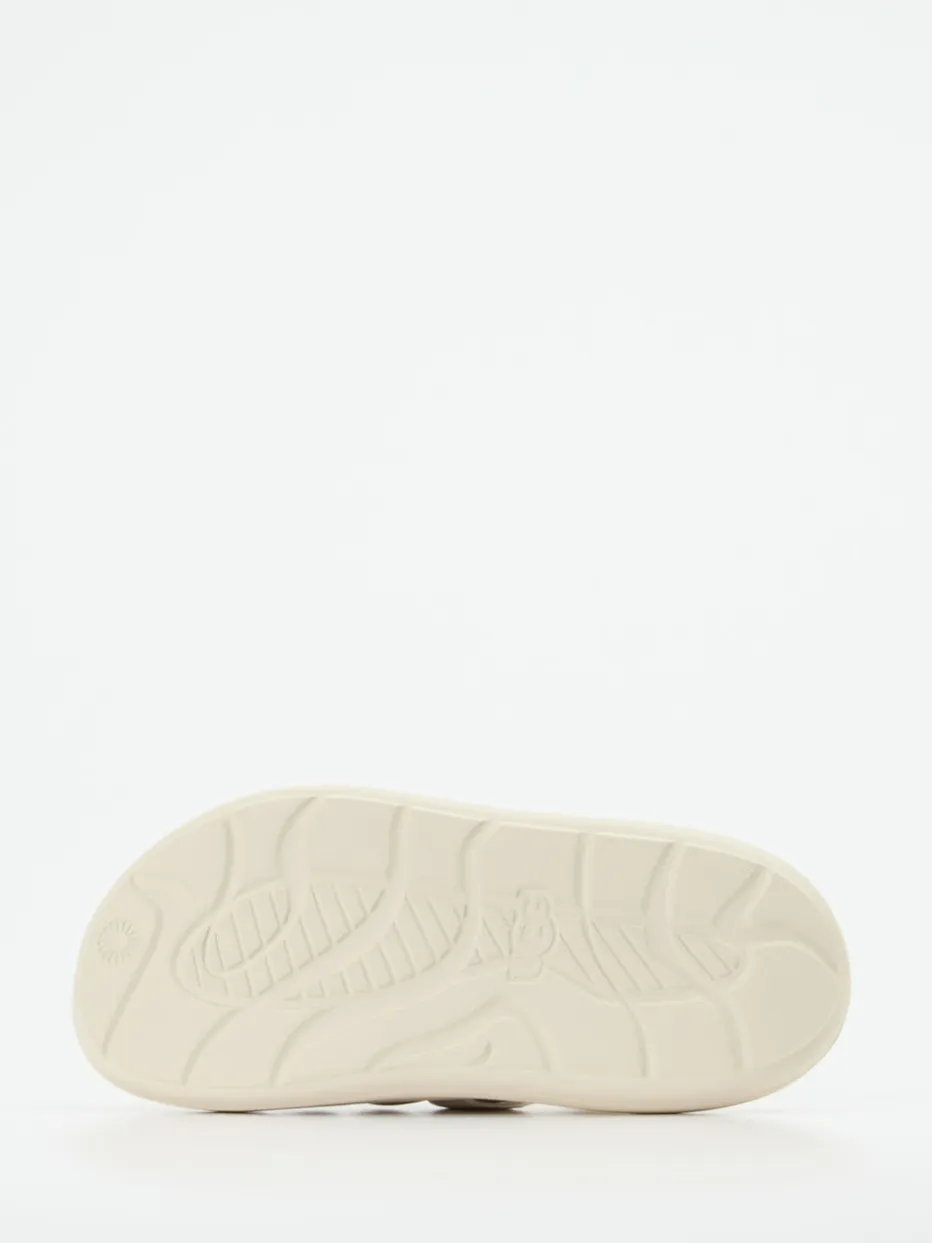 Robust trifft Sommerkomfort.UGG bringt mit dieser Chunky-Sandale ein vielseitiges Damenmodell für warme Tage. Ideal für Freizeitmomente am Pool, unterwegs in der Stadt oder beim Relaxen zu Hause: Der wasserabweisende Lammleder-Aufbau präsentiert sich in mattem Cremebeige und verleiht dem Design eine cleane, moderne Anmutung. Die gepolsterten Riemen und ein elastischer, abnehmbarer Fersenriemen mit Kontrastschriftzug ermöglichen variable Trageoptionen – als Slingback oder Slide. Abgerundete Silhouette, breite Sohle und profiliertes EVA-Fußbett spiegeln aktuelle Comfort-Trends mit Streetwear-Einfluss. Harmoniert optimal mit Oversize-Shirts und leichten Sommerhosen. UGG vereint wandelbares Design mit wetterfestem Material für lässigen Komfort.