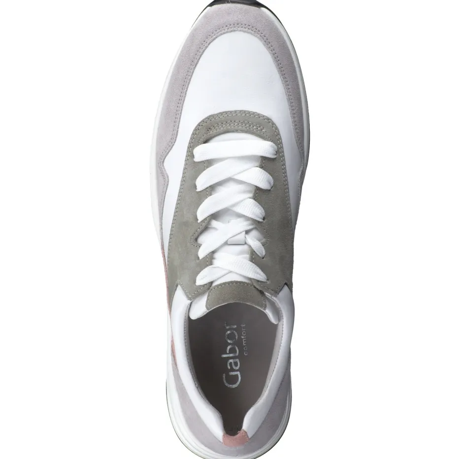 Moderner Komfort trifft Pastell-Trend.Gabor Comfort bietet mit diesem Damen-Chunky-Sneaker eine stilvolle Freizeitoption im aktuellen Streetwear-Look. Ideal für entspannte Alltagsmomente verbindet das Modell weißen Kalbledergrund mit samtig angeschliffenen Veloursleder-Details in Salbeigrün, Hellgrau und Altrosa. Der Materialmix kommt durch die Ton-in-Ton-Nähte und mehrfarbigen Overlays besonders zur Geltung. Die profilstarke Gummisohle sorgt für sicheren Auftritt, während die gepolsterten Schaftränder und eine herausnehmbare Innensohle den Tragekomfort unterstreichen. Der Look greift den Chunky-Trend auf und bleibt dabei angenehm kombinierbar. Ein Schuh für modebewusste Freizeitgestaltung mit Gabor-typischem Wohlfühlanspruch.