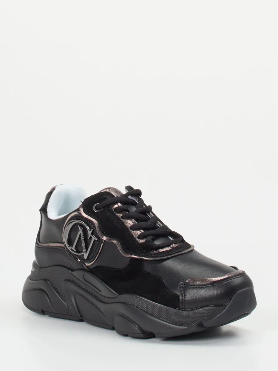 Statement-Piece mit Streetstyle-Faktor.CAFèNOIR präsentiert mit diesem voluminösen Damen-Sneaker einen stilprägenden Vertreter der Chunky-Trendwelle. Ob für City-Trips oder das nächste Ausgeh-Outfit – das Modell verbindet schwarzes Kalbleder mit samtig angeschliffenem Veloursleder und irisierend glänzenden Partien in Metallic-Bronze. Die voluminöse Silhouette wird durch die profilierte Gummisohle mit 4,5 cm Absatz und 3,5 cm Plateau betont. Ein auffälliges Logo-Emblem an der Seite unterstreicht den expressiven Charakter. Inspiriert vom Y2K-Revival, lässt sich der Schuh ideal mit Oversized-Fashion und strukturierten Accessoires kombinieren. Maximaler Stil für einen souveränen Auftritt – mit CAFèNOIR Signature-Design.