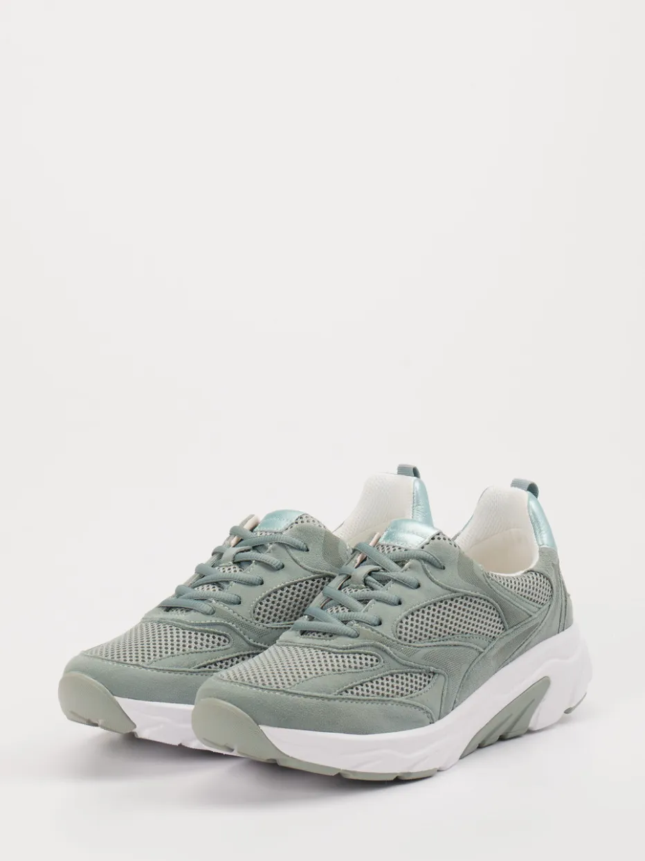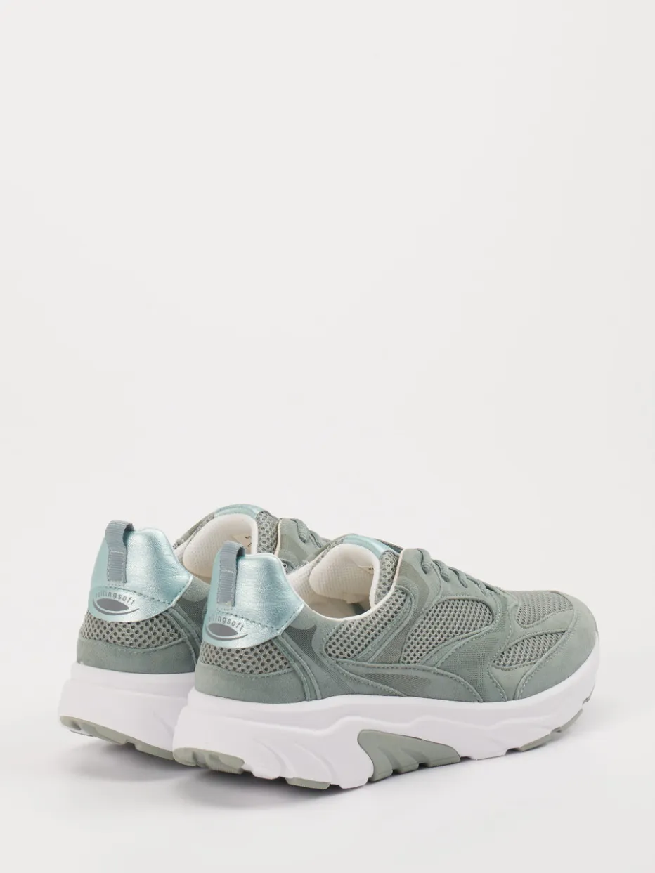 Trend-Pastell trifft Komfort-Sohle. Gabor Comfort präsentiert einen modisch-voluminösen Damen-Sneaker mit bequemer Passform. Ob für aktive Alltagseinsätze oder entspannte Freizeitmomente – dieser Chunky Sneaker überzeugt mit einem Mix aus Velour und Textilmaterial. Das atmungsaktive Mesh sorgt für ein angenehmes Fußklima, während die salbeigrüne Farbgebung mit Offwhite- und Hellmint-Akzenten modern wirkt. Die voluminöse Silhouette greift den Trend der Chunky Soles auf, unterstützt durch ein metallisches Fersenelement und tonale Nähte. Durch die Schnürung lässt sich der Sneaker individuell anpassen. In Kombination mit sportlich-legeren Outfits entfaltet er sein volles Style-Potenzial. Rollingsoft-Technologie für besonders komfortables Gehen im Alltag.
