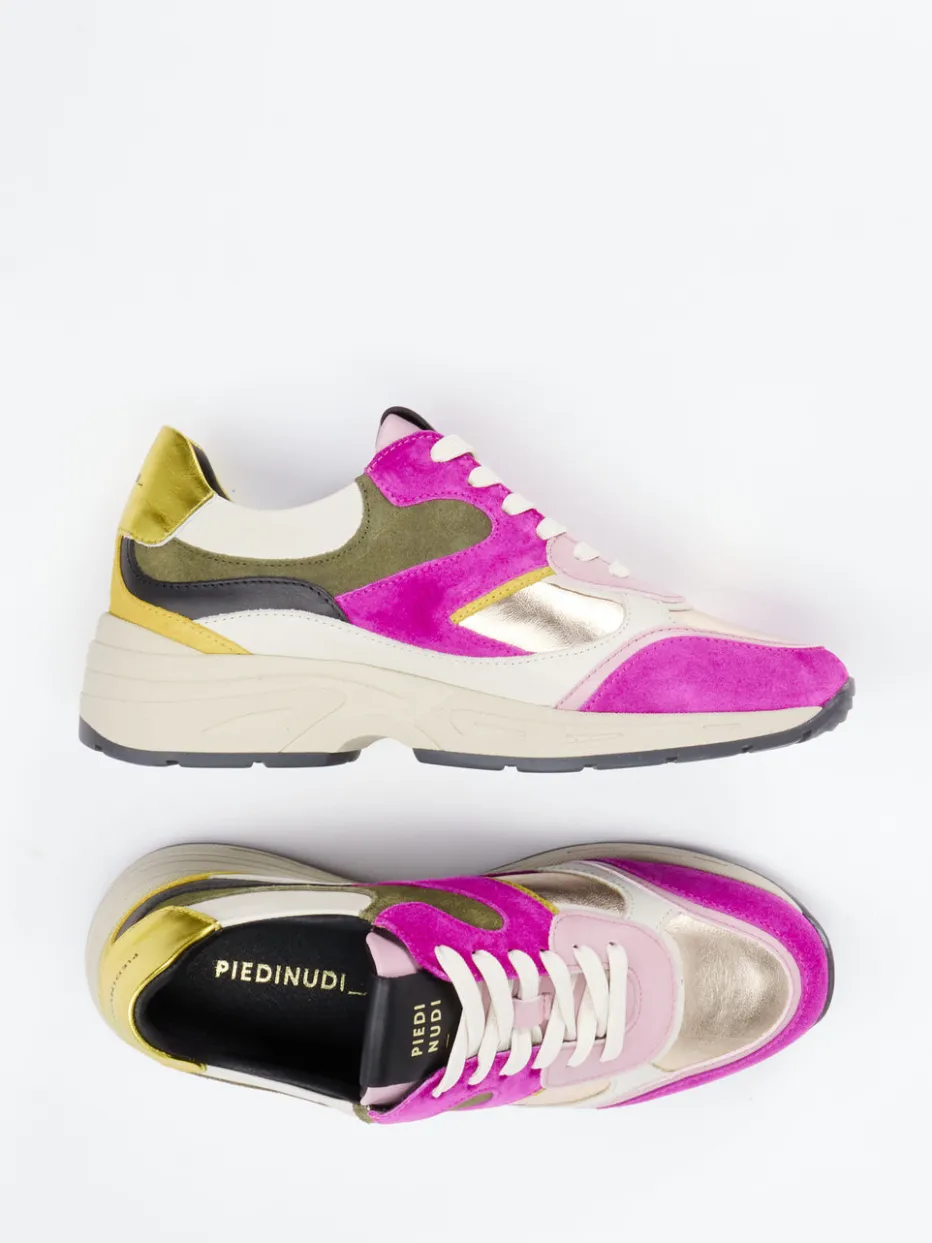 Stil-Statement mit Glanzfaktor.Piedi Nudi interpretiert den klassischen Damen-Sneaker neu – als trendigen Chunky Sneaker mit auffälligem Design. Für alle, die modischen Ausdruck suchen, kombiniert dieses Modell samtig angeschliffenes Veloursleder mit glänzenden Metallic-Partien in Gold und Magenta. Die voluminöse Silhouette, kontrastreiche Farbflächen und die gepolsterte Zunge mit Logo prägen das markante Profil. Mit Schnürung und komfortabler Gummisohle ausgestattet, eignet sich der Schuh ideal für Alltag oder Ausgehmomente im Y2K-Style. Besonders angesagt: die Verbindung aus Colorblocking und Streetwear-Ästhetik. Ein Eyecatcher mit Komfortcharakter – stilvoll und selbstbewusst.