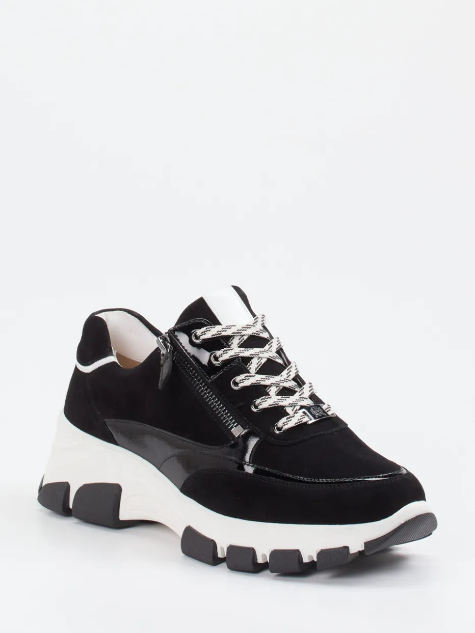 Stilvoll durch Alltag & Freizeit.Der Sneaker von Hassia bringt modische Streetwear-Elemente in die Kategorie Bequemschuh. Ob für den Stadtbummel oder lange Wege im Alltag – die Kombination aus samtigem Veloursleder und glänzenden Lackeinsätzen in Schwarz schafft eine kontrastreiche Optik. Die voluminöse Chunky-Silhouette mit profilierter Gummisohle verleiht dem Schuh eine sportliche Präsenz. Schnürung und seitlicher Reißverschluss bieten optimalen Halt sowie unkompliziertes Anziehen. Das Mikrofaser-Innenfutter ist besonders dehnbar, auch bei empfindlicher Fußform. Trendiger Komfort mit markanter Ästhetik – typisch Hassia.