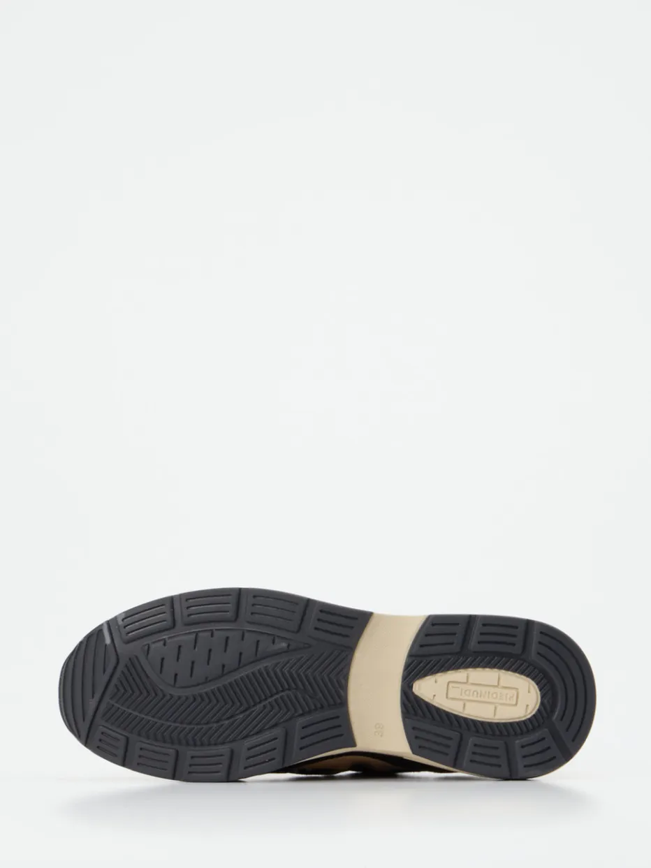Mehrlagiger Materialmix mit Struktur.Piedi Nudi präsentiert diesen Damen-Sneaker in angesagter Chunky-Form. Die Kombination aus Alltagstauglichkeit und expressivem Design kommt hier besonders gut zur Geltung. Veloursleder mit samtiger Oberfläche trifft auf textile Elemente in Zebra-Optik und synthetische Glanzakzente in Gold. Mit seinem hellbraun-schwarzen Colorway und der voluminösen Silhouette wirkt der Schuh sportlich und selbstbewusst. Eine strapazierfähige Gummisohle mit guter Dämpfung sowie eine Schnürung sorgen für Tragekomfort im Alltag. Der Modestil greift Streetstyle-Codes und Retro-Running-Elemente auf. Ein Statement-Sneaker mit Stilanspruch und modischem Animal-Print-Fokus.
