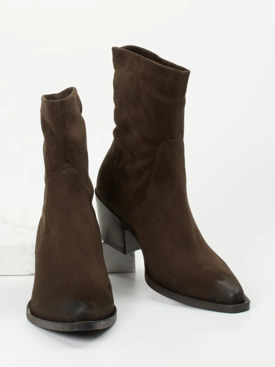 Hochwertiges Veloursleder trifft auf moderne Western-Anmutung – stilistische Präzision für herbstliche Trend-Looks. Eine Stiefelette mit klarer Formensprache und Komfortdetails.