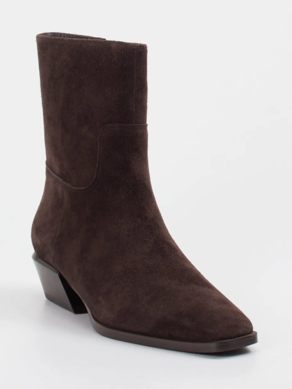 Ideal für urbane Freizeit-Looks oder abendliche Ausgeh-Momente: Der gerade Schaft und die spitz zulaufende Front aus samtig mattiertem Veloursleder in Dunkelbraun verleihen dem Modell zeitlose Raffinesse. Der markante 4-cm-Blockabsatz im Western-Stil unterstreicht den modischen Minimalismus und korrespondiert elegant mit dem Ton-in-Ton gehaltenen Reißverschluss. Als Teil des Trends „Modern Western FW24“ lässt sich die Stiefelette vielseitig mit Kaschmirmantel oder Lederbag kombinieren.