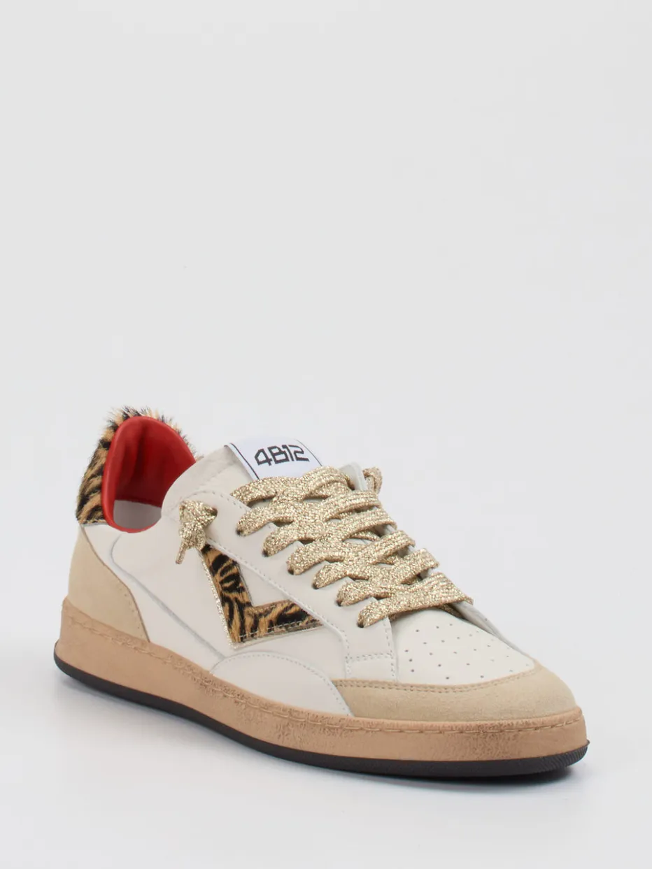 Luxus trifft lässige Streetwear.Der Sneaker von 4B12 bringt frischen Esprit in die Low-Top-Kategorie. Ideal für urbane Looks mit Charakter: Der beigefarbene Sneaker überzeugt mit einem edlen Materialmix aus samtigem Veloursleder und glattem Leder. Goldfarbene Glitzerschnürsenkel, animalisch gemusterte Kunstfell-Details am Fersenbereich und ein rotes Lederinnenfutter sorgen für visuelle Reize. Die klassische, flache Silhouette ruht auf einer schwarzen Gummisohle mit Fischgrätenprofil und bietet zuverlässigen Tragekomfort. Inspiriert von Retro-Sportswear und aktuellen Streetstyle-Einflüssen ist dieses Modell perfekt für trendorientierte Freizeit- und Ausgeh-Outfits. Kombiniert mit Denim oder Metallic-Accessoires entsteht ein stylisches Statement. Verbindet Eyecatcher-Looks mit dem Qualitätsanspruch der Marke.
