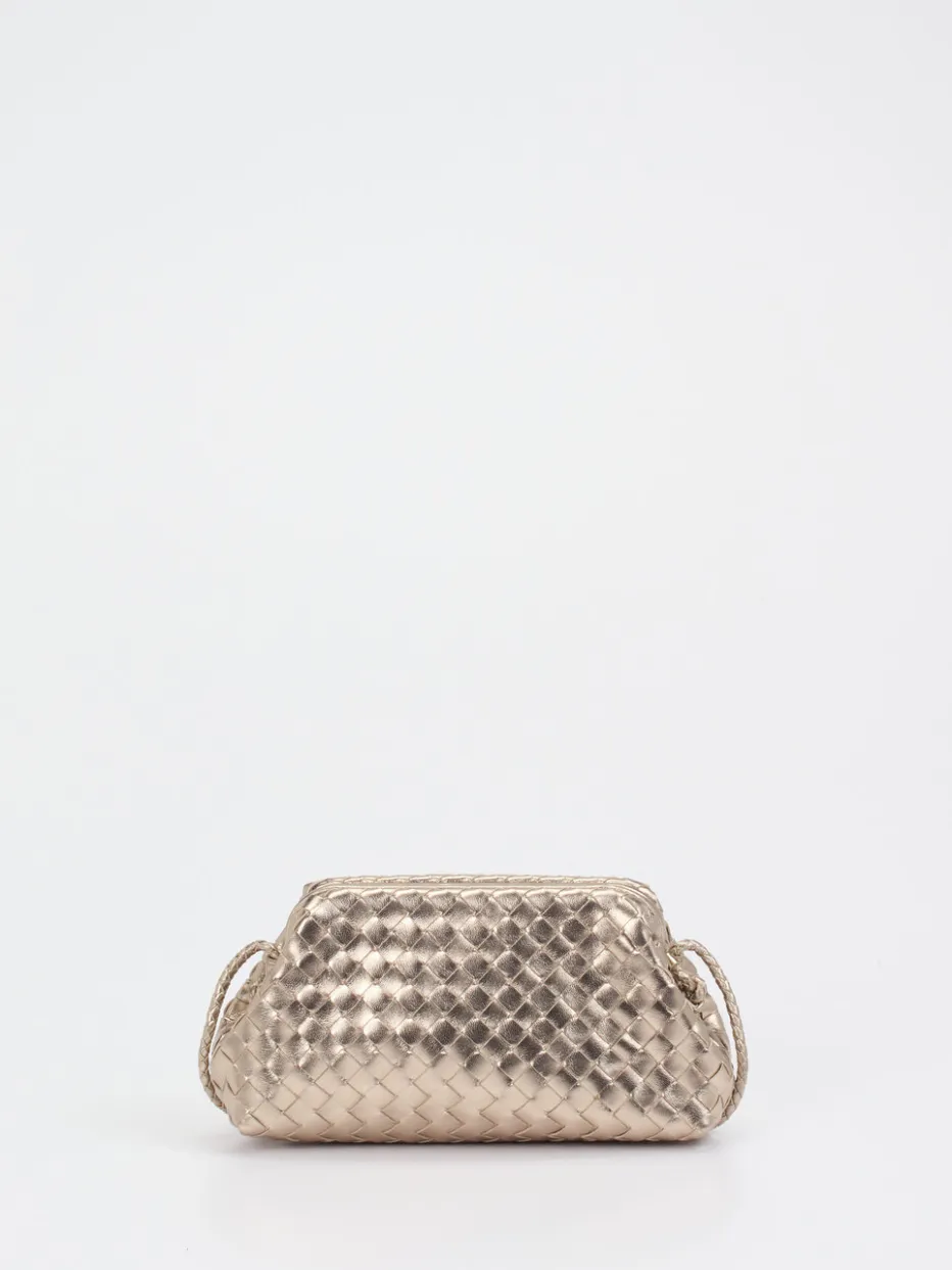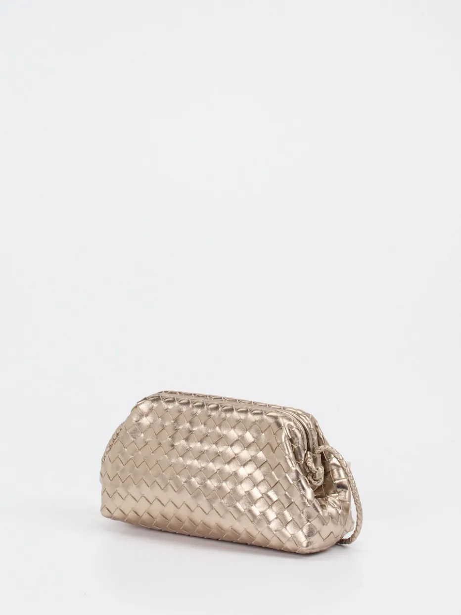 Die fein gearbeitete Trapezform und das champagnergoldene Metallic-Finish vereinen traditionelle Flechtkunst mit modernem Minimalismus. Ein elegantes Accessoire für stilvolle Auftritte.