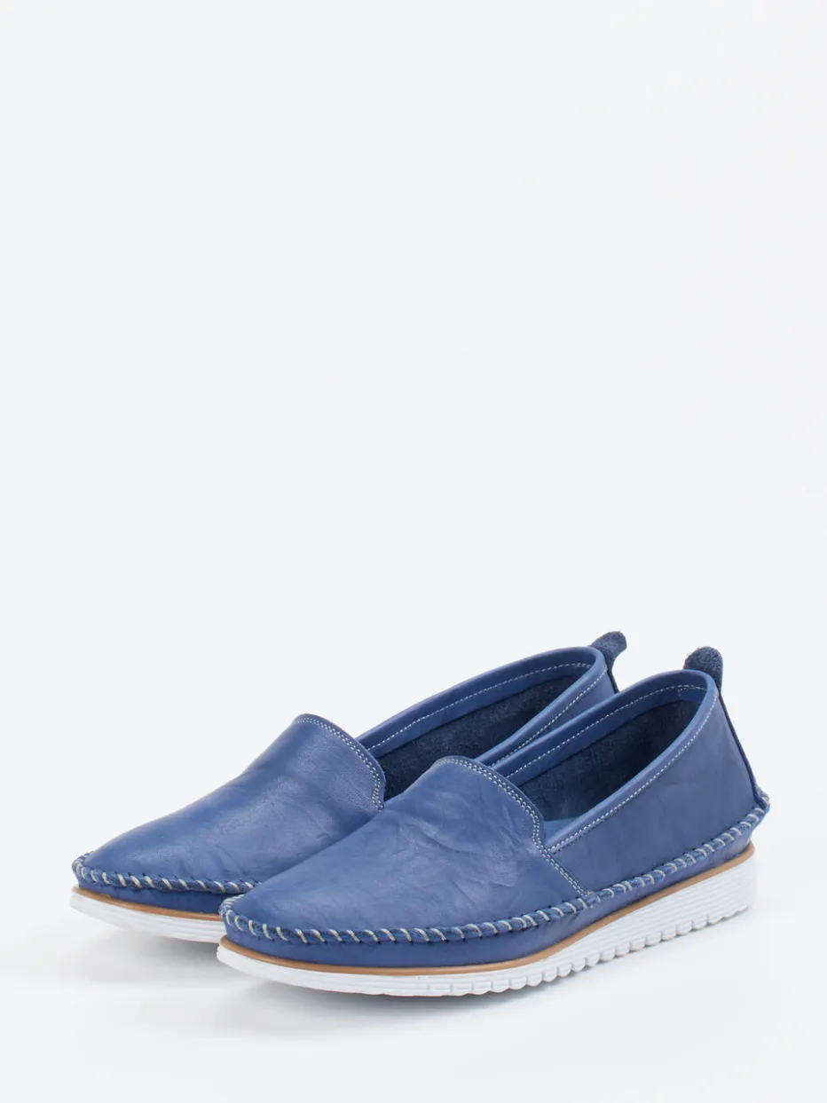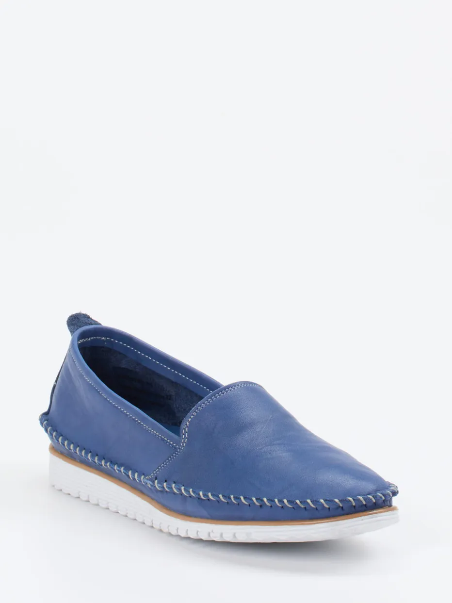 Sommerleicht und stilvoll bequem.Andrea Conti präsentiert einen vielseitigen Damen-Komfortslipper mit handwerklicher Ausstrahlung. Ideal für entspannte Tage im Büro oder spontane Aktivitäten im Freien: Das matte Kalbleder in Jeansblau zeigt sich soft und anschmiegsam, während kontrastierende weiße Steppnähte gekonnt Akzente setzen. Die flache, rund zulaufende Silhouette in Schlupfform sorgt für unkompliziertes Anziehen, ergänzt durch eine Zuglasche und eine zweifarbige, flexibel profilierte Gummisohle. Modisch verortet im „Comfort Revival“-Trend lässt sich der Schuh problemlos mit leichten Cardigans oder Denim kombinieren. Ein bequemer Alltagsbegleiter mit sommerlicher Leichtigkeit und stilvollem Understatement.