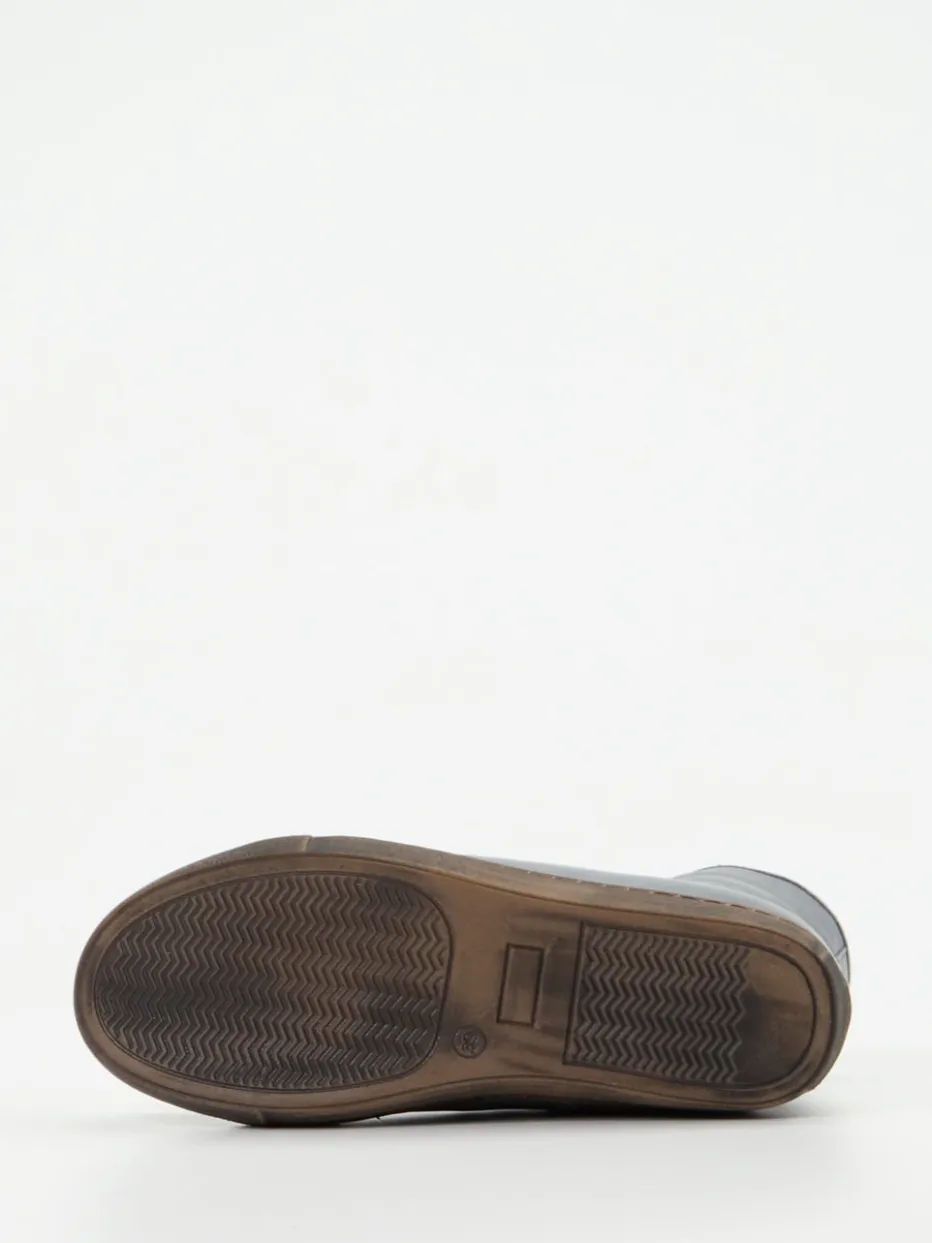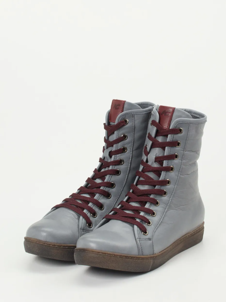 Ideal für entspannte City-Tage oder Spaziergänge bei kühlem Wetter: Das stahlgraue Kalbleder mit matter Oberfläche bietet eine samtig-weiche Haptik und ist gleichzeitig strapazierfähig. Bordeauxfarbene Details an Zunge und Schnürsenkeln setzen modische Kontraste, während der seitliche Reißverschluss schnelles An- und Ausziehen ermöglicht. Die Vintage-Gummisohle mit rutschhemmendem Profil verstärkt den Retro-Charakter und sorgt für gute Traktion. In ihrer schlanken, knöchelhohen Form wirken die Boots lässig—perfekt zu Oversize-Strick und Jeans.