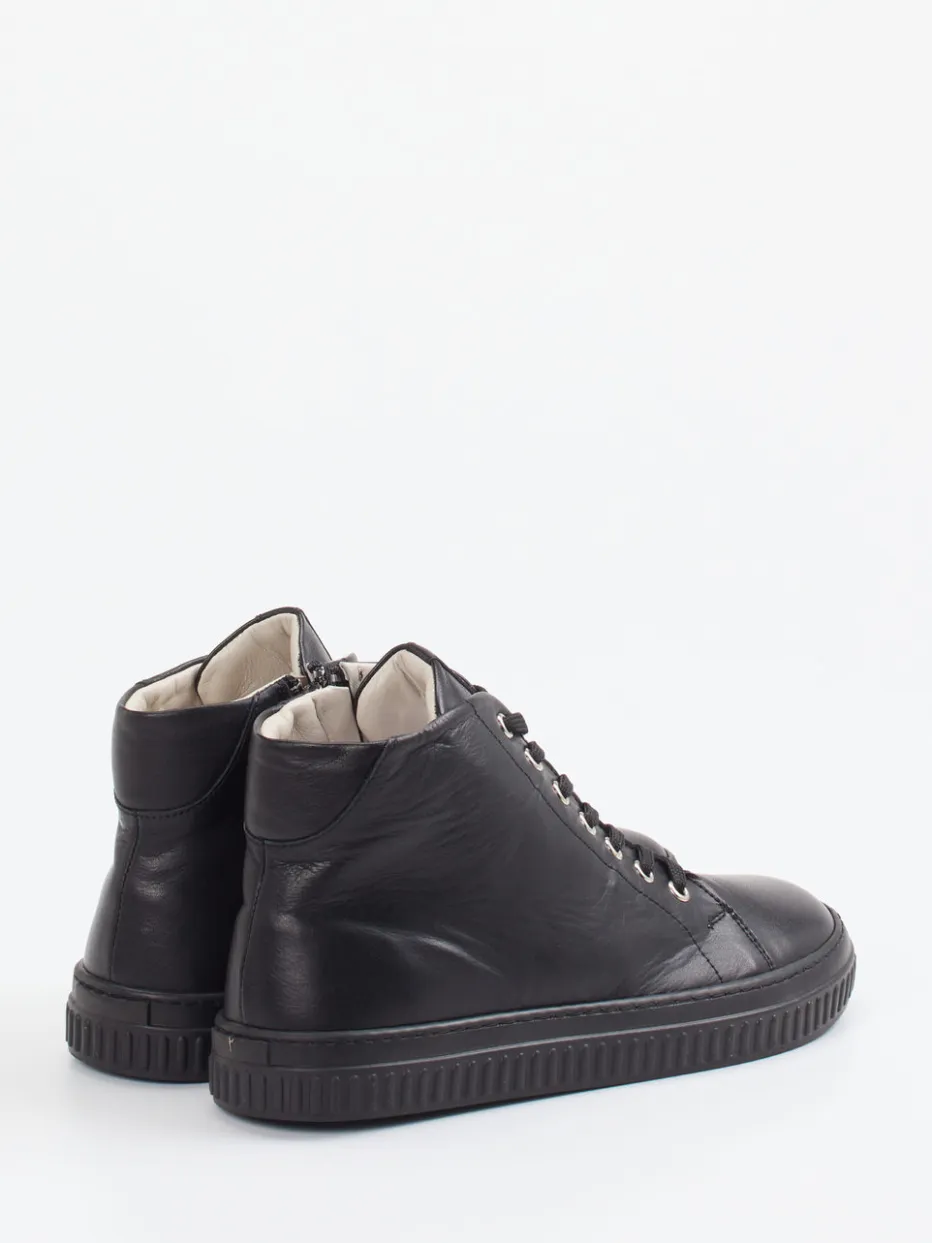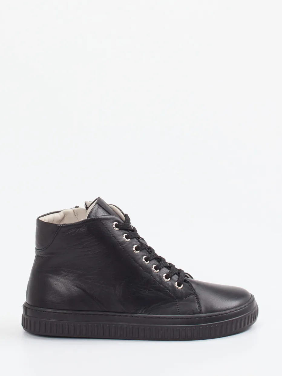 Minimalismus trifft Funktionalität.Andrea Conti präsentiert mit dieser knöchelhohen Schnürstiefelette einen puristischen Damen-Sneaker für Alltag und Büro. Die zeitlose schwarze Optik mit matter Kalbleder-Oberfläche und silberfarbenen Ösen passt ideal zu urbanen Looks. Schnürung und seitlicher Reißverschluss bieten hohen Komfort beim An- und Ausziehen. Die profilierte Gummisohle sorgt für sicheren Grip auf verschiedensten Untergründen, während das gepolsterte Textilfutter angenehmen Halt gibt. Die klare Linienführung unterstreicht den minimalistischen Streetwear-Charakter – ein urbaner Clean Look in perfekter Balance. Ein stilsicherer Begleiter mit bequemer Passform und durchdachter Funktionalität.