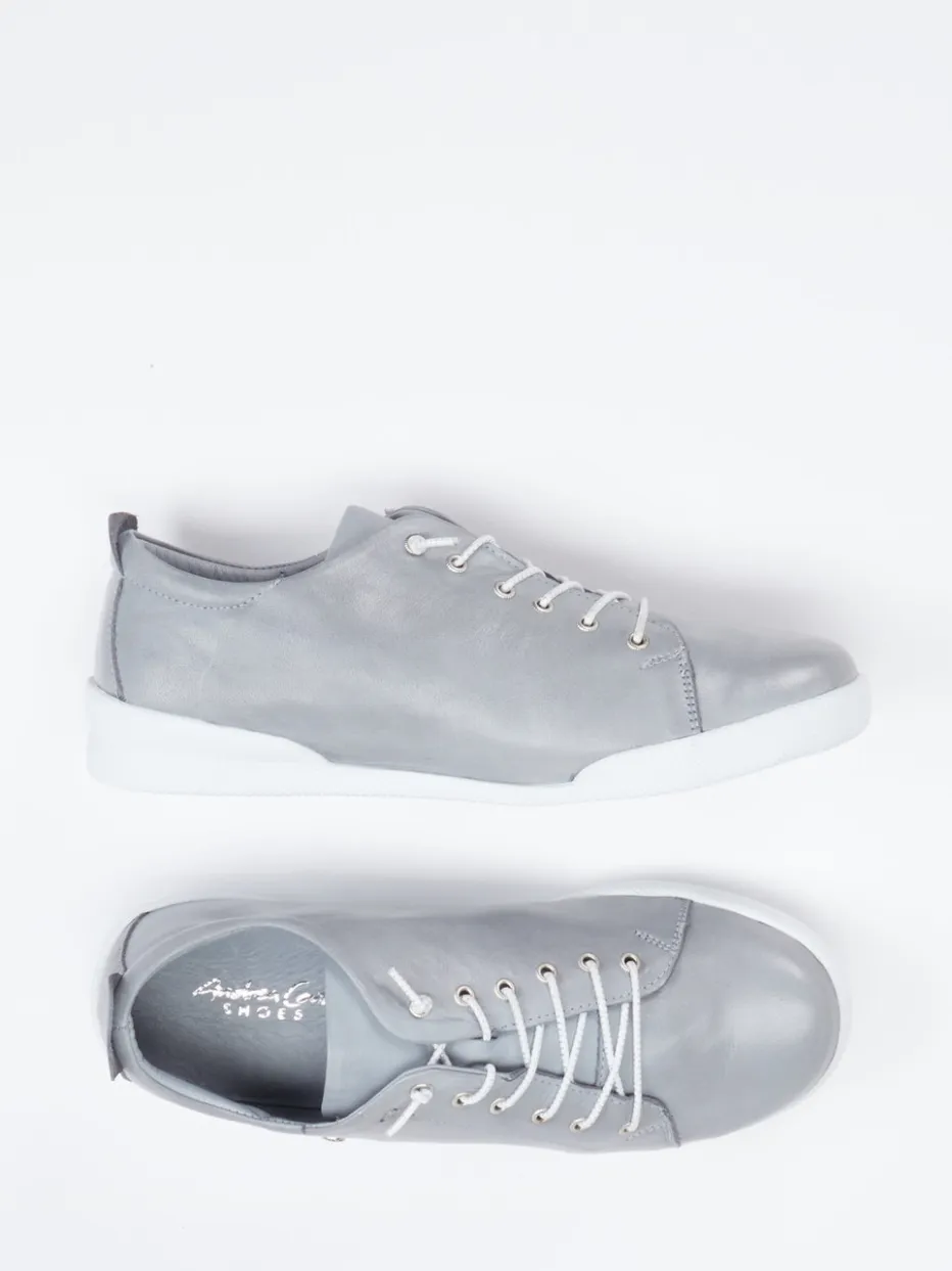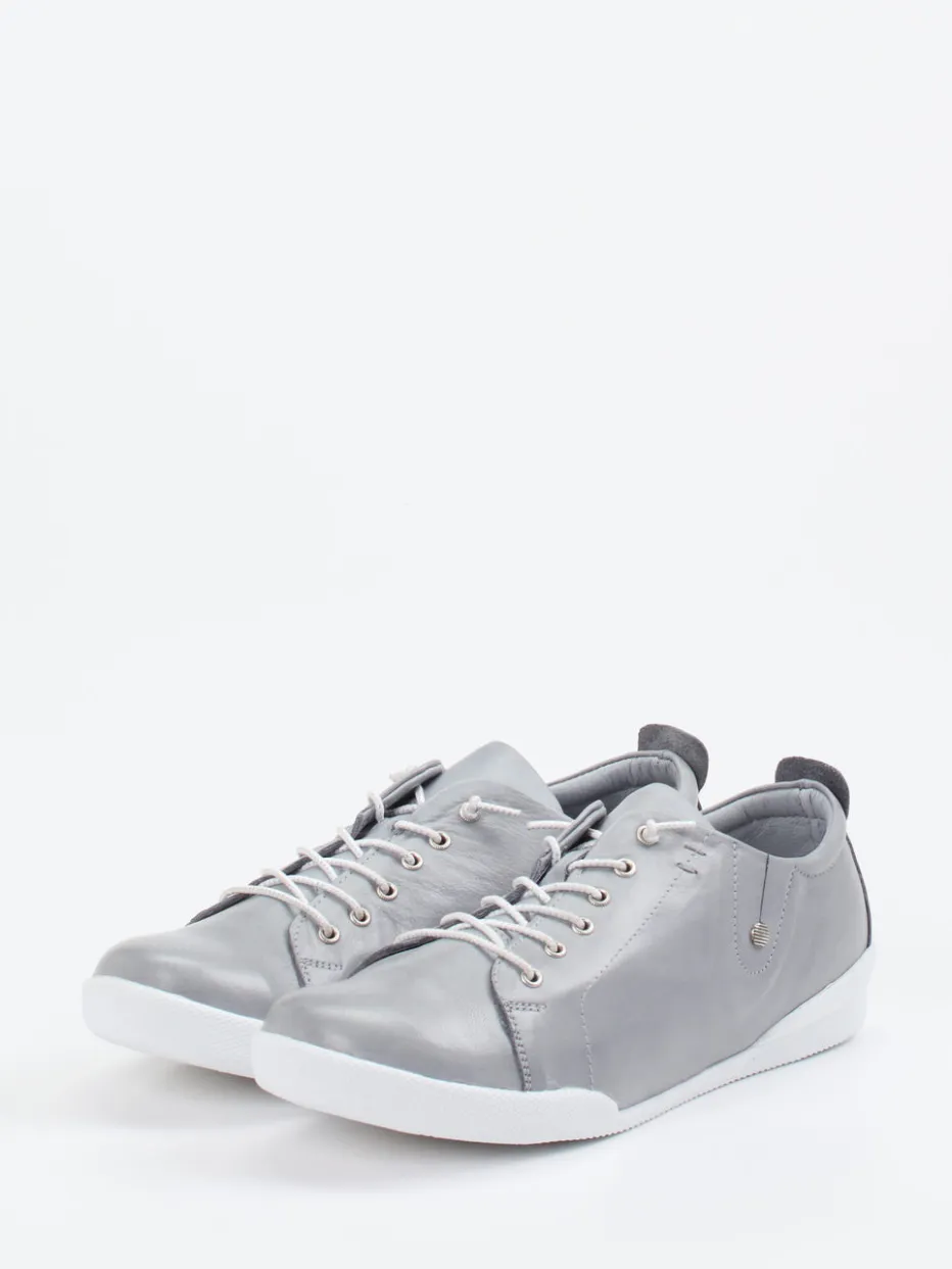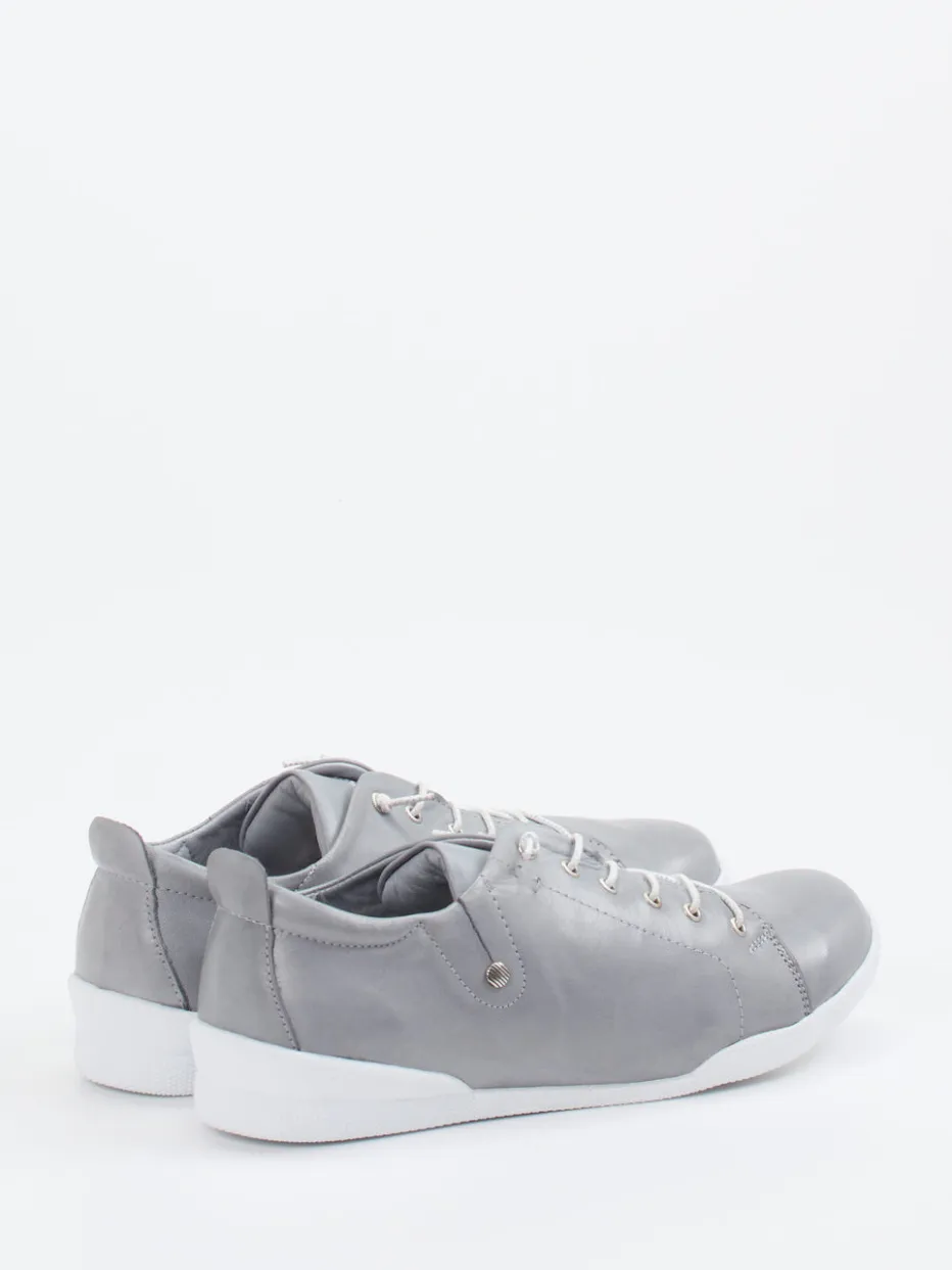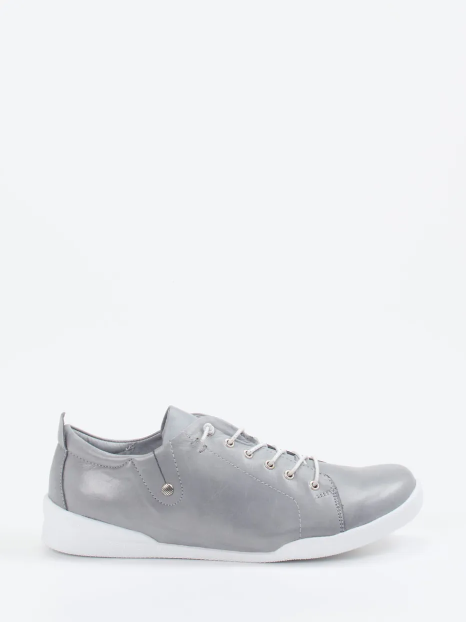 Silberne Leichtigkeit mit Komfortanspruch.Andrea Conti präsentiert mit diesem Damen-Sneaker ein Modell für Alltag und Freizeit. Das silberfarbene Kalbleder zeigt sich matt und weich, mit glatter Oberfläche und dezenter Farbwirkung. Die klassische, niedrig geschnittene Silhouette wird durch eine weiße Gummisohle und kontrastierende Schnürung mit glitzernden Elementen aufgelockert. Der weich gepolsterte Einstieg und das herausnehmbare, lederbezogene Fußbett bieten angenehmen Tragekomfort – auch für eigene Einlagen geeignet. Der Look fügt sich nahtlos in minimalistische Casualstyles ein. Ein durchdachter Begleiter für entspannte Momente mit dezenter Stilwirkung.