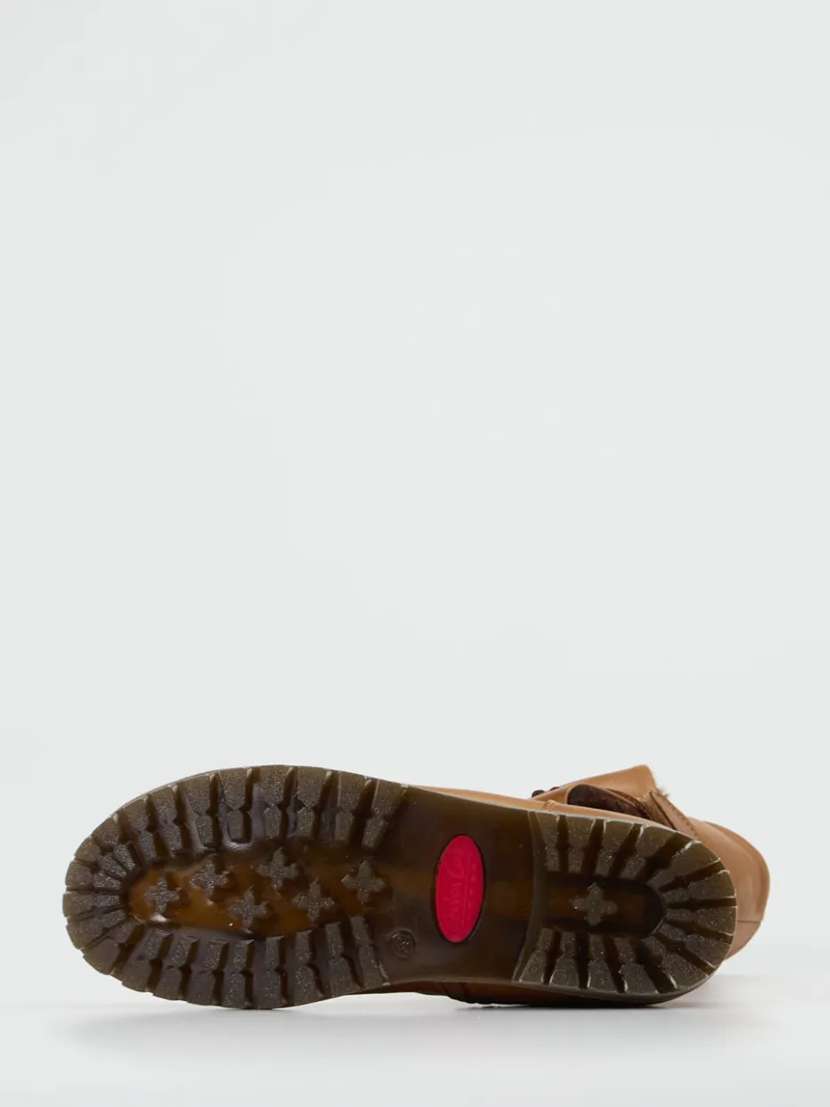 Stilvoll & wetterfest durch Herbst und Winter.Andrea Conti präsentiert mit dieser Damen-Stiefelette einen alltagstauglichen Winterboot im klassischen Design. Das weiche Kalbleder in warmem Cognacton erhält durch eine matte Oberfläche und helle Ton-in-Ton-Nähte eine dezente Struktur. Die mittelhohe, runde Silhouette sorgt mit warmem Kunstfellfutter und robuster Gummisohle mit Profil für Tragekomfort bei kaltem Wetter. Akzente wie Reißverschluss, Zierschnalle und ein handwerklich anmutendes Riemchen unterstreichen den Utility-Look. Ideal zu Steppmantel und Thermo-Leggings für lässige Outdoor-Outfits. Ein funktionaler Lederboot mit klarer Formensprache – typisch Andrea Conti.
