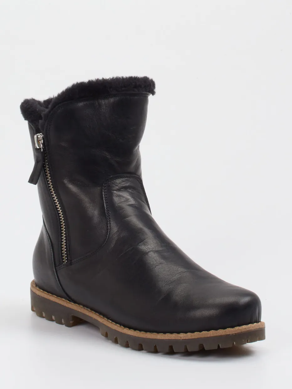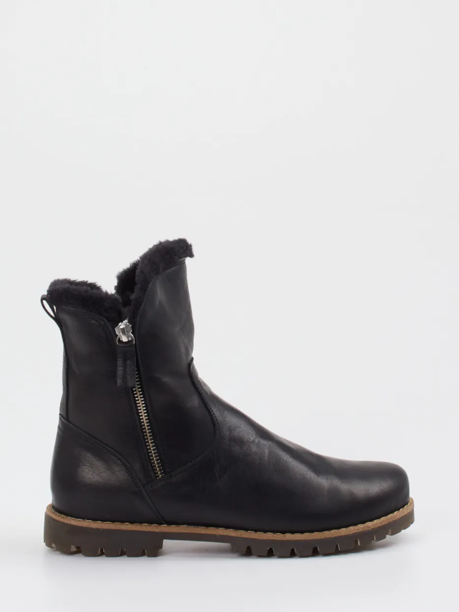 Wärme und Funktion vereint.Andrea Conti zeigt mit dieser Stiefelette ein Damenmodell aus der Kategorie Winterboots. Ideal für kalte Alltagssituationen wie den Weg ins Büro oder Spaziergänge im Schnee: Das schwarze Kalbleder erhält durch die matte Oberfläche eine schlichte Eleganz, während das weiche Warmfutter aus Textilfasern Innenkomfort garantiert. Der seitliche Reißverschluss sorgt für bequemes An- und Ausziehen, die profilierte Gummisohle bietet festen Halt – auch bei Nässe. Klare Nähte und silberfarbene Details unterstreichen die minimalistische Formsprache mit Utility-Einschlag. Ein stilvoller Winterstiefel – für Funktion, Komfort und dezente Modernität.