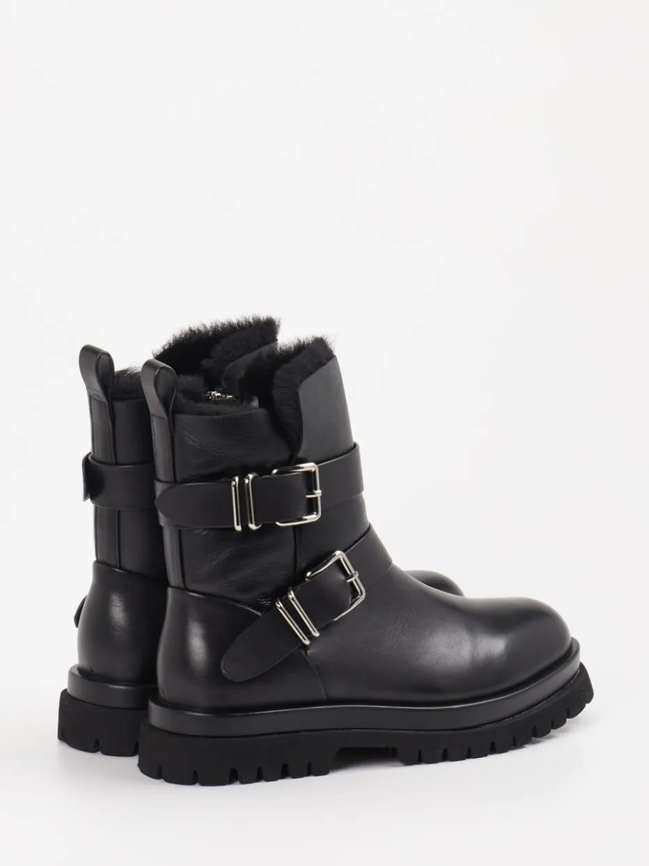 Winterfest mit Stil. Andrea Puccini präsentiert eine derbe Biker-Stiefelette für Damen. Für kalte Tage in der Stadt oder beim Spaziergang im Park bietet diese Stiefelette zuverlässige Wärme dank kuscheligem Lammfellfutter. Sie ist aus schwarzem Lammleder gefertigt, das mit glatter, glänzender Oberfläche überzeugt. Zwei silberfarbene Schnallen setzen markante Akzente, während ein Innenreißverschluss das Anziehen erleichtert. Die klassische Silhouette trifft auf eine rutschfeste Gummisohle mit robustem Profil – praktische Utility-Ästhetik im Trendformat. Ein sichtbares Kunstfellfutter am Schaftrand und eine rückseitige Zuglasche runden den Look ab. Besonders gut kombinierbar mit Steppjacke und Crossbody-Bag. Ein Modell, das Komfort mit urbaner Coolness vereint.