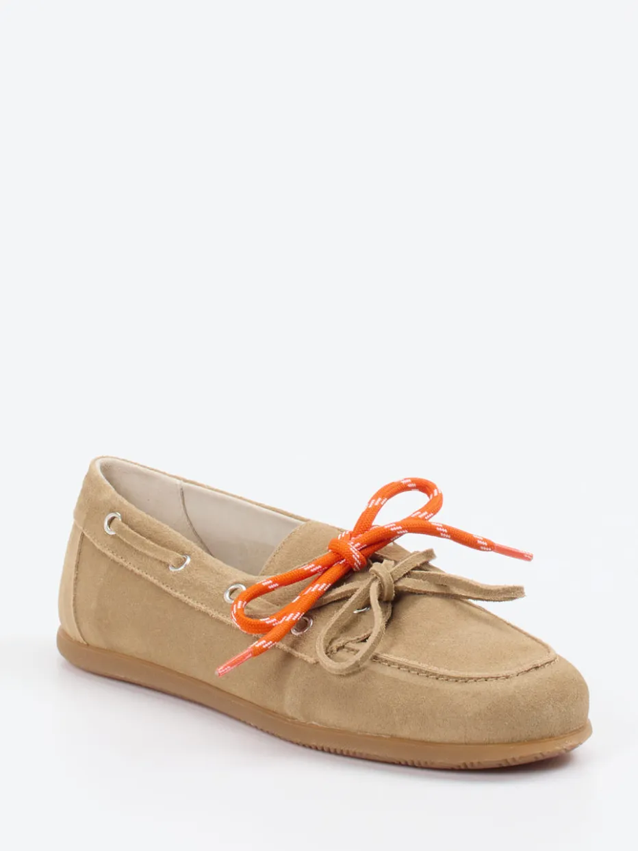 Ob beim entspannten Stadtbummel oder auf dem Weg zum Strand – dieser beige Bootsschuh verbindet lässigen Komfort mit klarer Formsprache. Das samtig angeschliffene Veloursleder betont die flache, gerundete Silhouette und harmoniert mit der hellen Gummisohle. Auffällige Kontrastschnürsenkel in Orange mit weißen Details und silberfarbene Metallösen verleihen dem Modell einen frischen Preppy-Twist. Ideal zu Leinenhosen und sommerlichen Outfits, passt er perfekt in moderne „Quiet Luxury“-Looks.