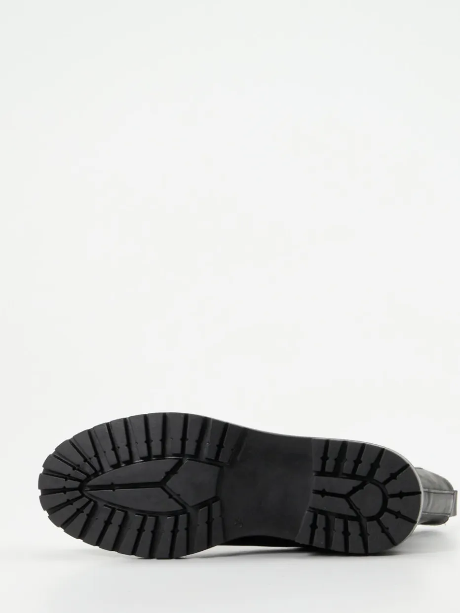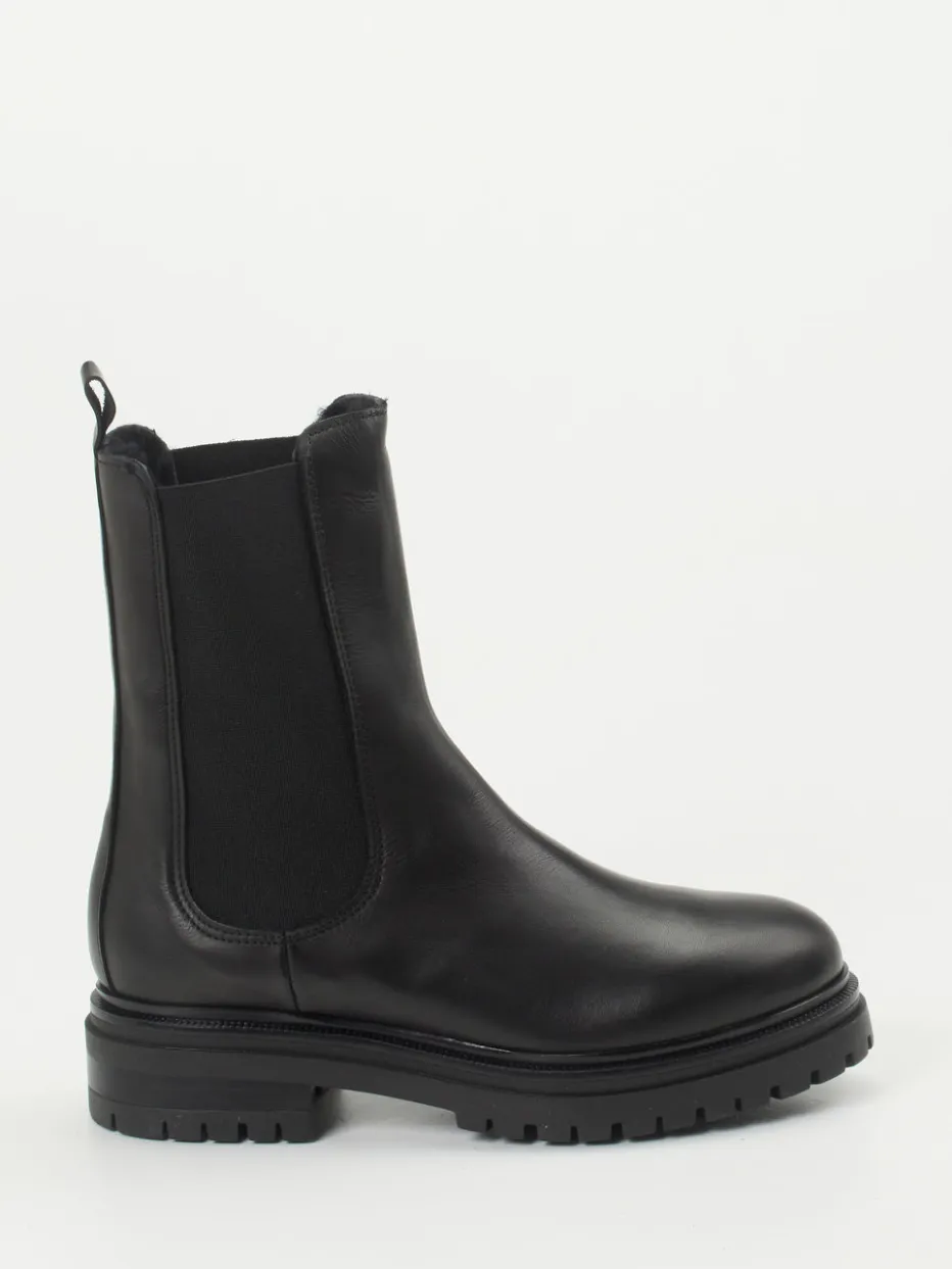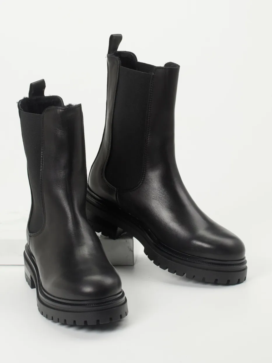 Gefertigt aus feinem Kalbleder mit matter Oberfläche vereinen die Boots Komfort und Purismus. Markante Elastikeinsätze und eine Zuglasche erleichtern den Einstieg, während das flauschige Lammfellfutter angenehme Wärme spendet. Die schwere Gummisohle mit betontem Profil garantiert Trittsicherheit und interpretiert das klassische Design urban-modern. In Kombination mit minimalistischen Outfits entfaltet der Schuh seinen vollen Reiz.