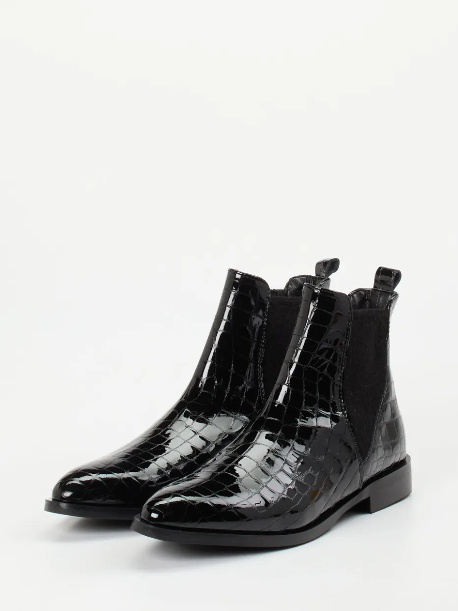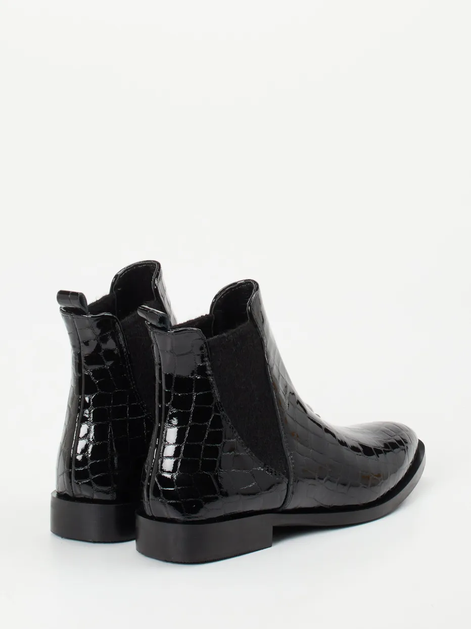 Die glänzenden Chelsea Boots von Andrea Puccini zeigen Lackleder in Kroko-Optik und verbinden Minimalismus mit femininer Raffinesse. Ideal für Business-Casual-Looks mit modernem Twist.