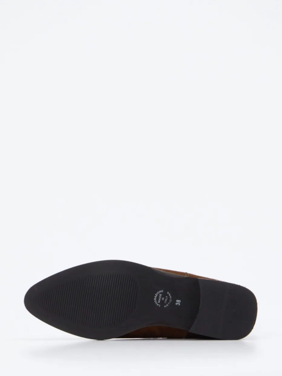 Stilvoll durch die Übergangszeit.Andrea Puccini präsentiert klassische Chelsea Boots für Damen aus hochwertigem braunem Veloursleder. Ideal für Büro oder Stadtspaziergang verbinden diese Boots ein Design mit schmal zulaufender Silhouette und matt strukturierter Oberfläche mit hohem Tragekomfort. Charakteristisch sind die textilähnlichen Ton-in-Ton-Elastikeinsätze in Wollfilz-Optik und funktionale Zuglaschen, die schnelles An- und Ausziehen ermöglichen. Die leichte Gummisohle sorgt für Alltagstauglichkeit, das Futter aus fein verarbeitetem Kalbleder für ein angenehmes Fußklima. Als Teil des „Quiet Luxury“-Trends setzen sie auf dezente Raffinesse. Besonders gut kombinierbar mit Kaschmirmantel und Lederaccessoires. Ein durchdachtes Essential mit italienischem Stilverständnis.