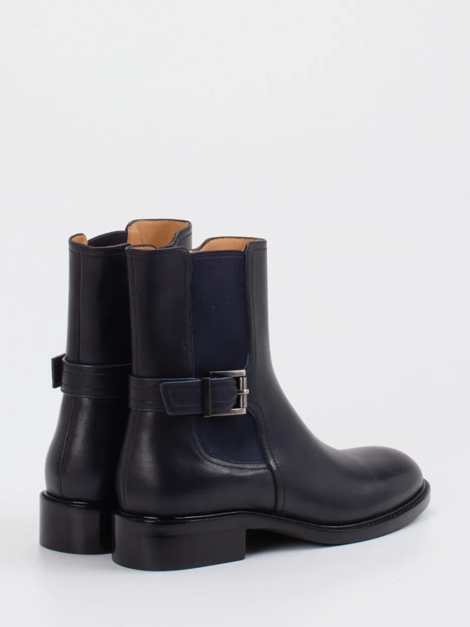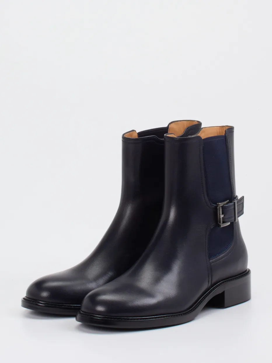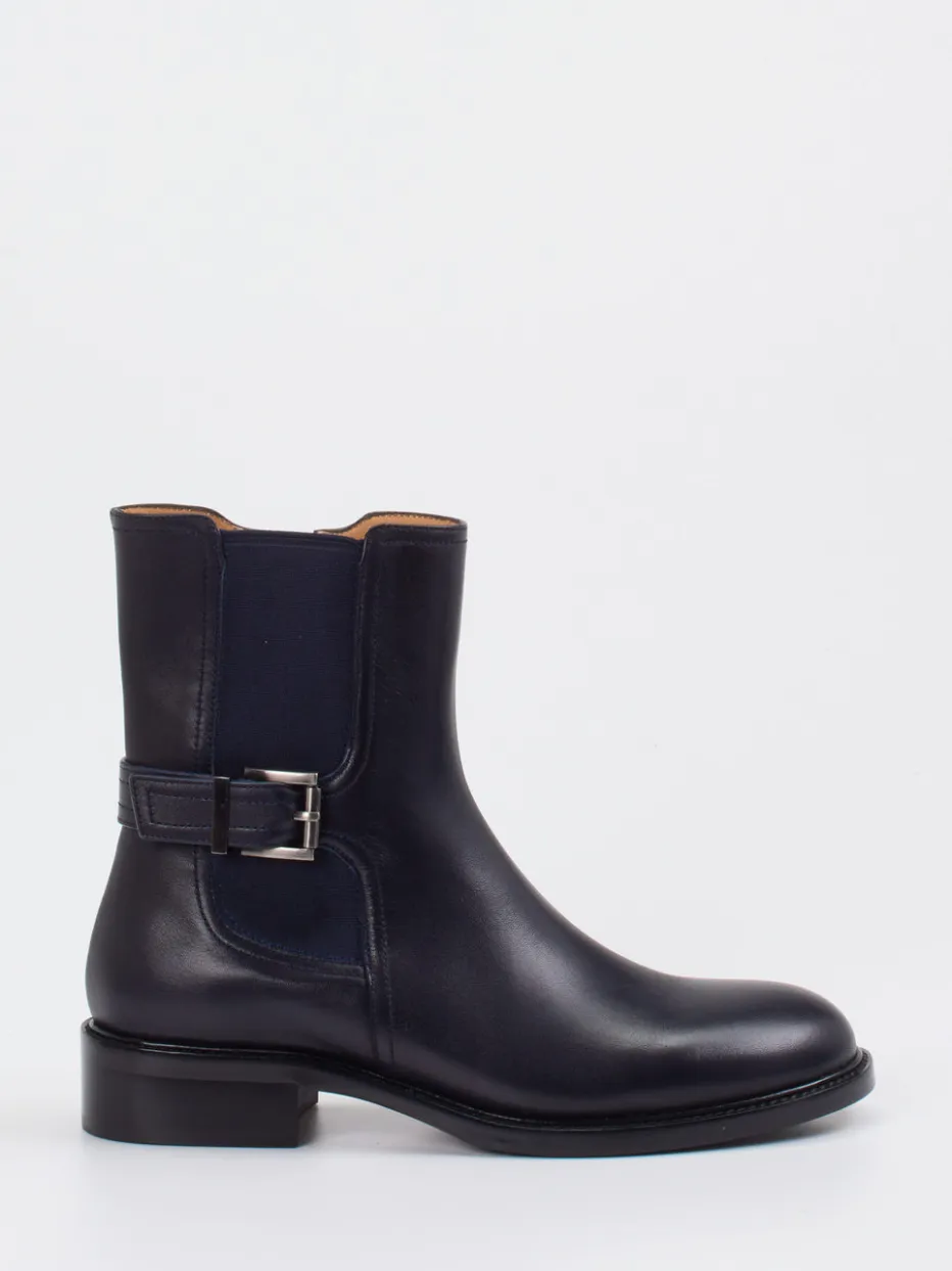 Stilsicherheit im Alltag.Andrea Puccini präsentiert eine Damen-Stiefelette im Chelsea-Stil mit modernem Understatement. Ob zu schmalen Stoffhosen im Büro oder zu Denim am Wochenende – diese Stiefelette überzeugt mit glänzendem Glattleder in Tiefdunkelblau, elastischen Einsätzen sowie einer seitlichen Zierschnalle in Silberoptik. Die schmale Silhouette und der komfortable Innenreißverschluss unterstreichen den funktionalen Charakter mit schickem Twist. Die flache Gummisohle samt 3 cm Absatz sorgt für angenehmen Laufkomfort. Inspiriert vom Trend „Quiet Luxury“, harmoniert der Look mit minimalistischer Garderobe. Ein hochwertiger Alltagsbegleiter mit dezenter Exklusivität.