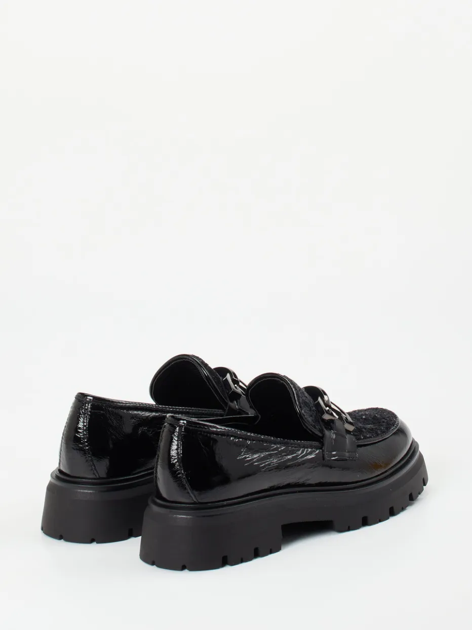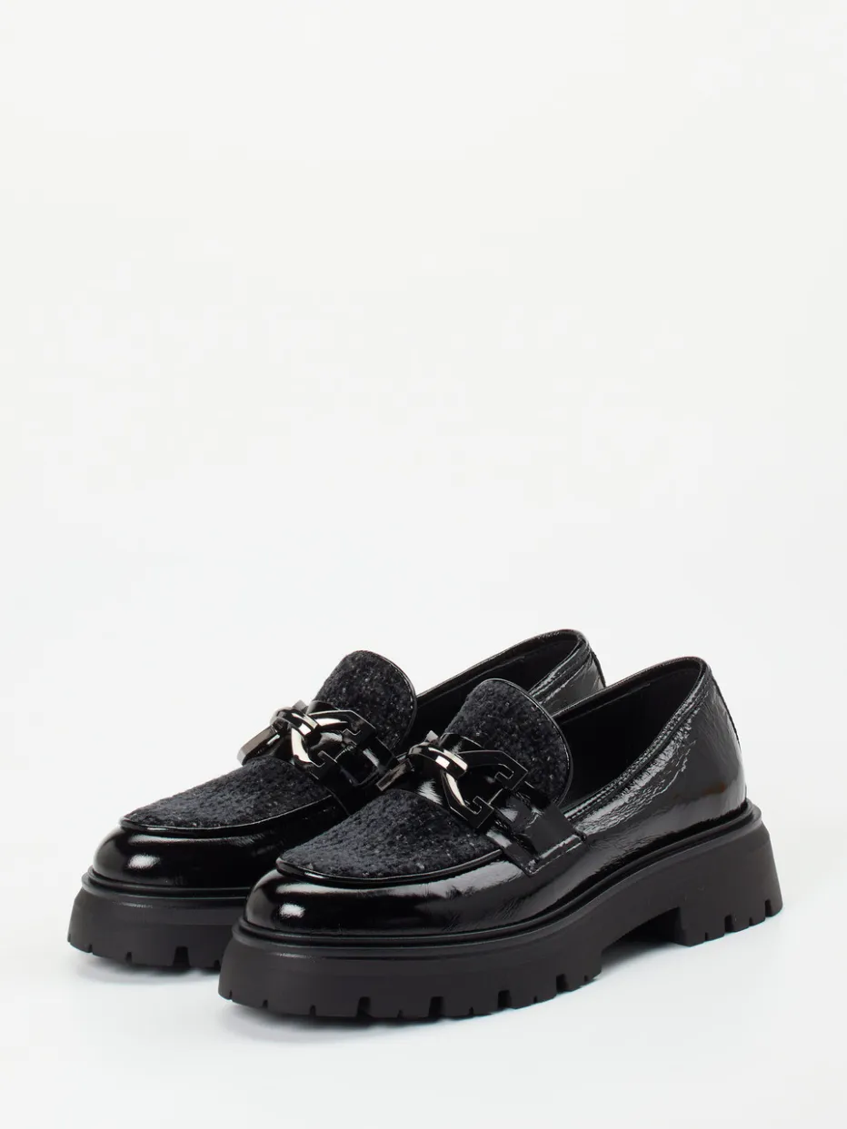 Ideal für stilbewusste Tage in der Stadt vereint der Chunky-Loafer schwarzes Lackleder mit samtartig strukturiertem Wollfilz auf dem Blatt. Die klassische Silhouette mit seitlichen Einkerbungen sorgt für einen komfortablen Einstieg, während die auffällige Gliederkette in silberfarbener Metalloptik einen eleganten Kontrast bietet. Die voluminöse Plateau-Gummisohle mit markantem Profil gewährleistet Trittsicherheit und liegt voll im Materialmix- und Chunky-Trend für Herbst/Winter. Perfekte Ergänzung zu Oversized-Blazer und Crossbody-Bag.