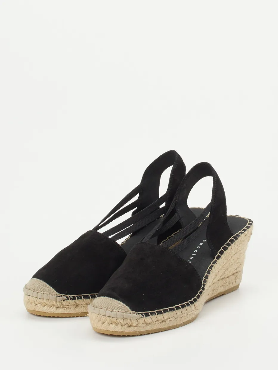 Sommerlich interpretiertes Espadrille-Design kombiniert mit hochwertigem Veloursleder und flexiblen Elastikriemen für optimalen Komfort.