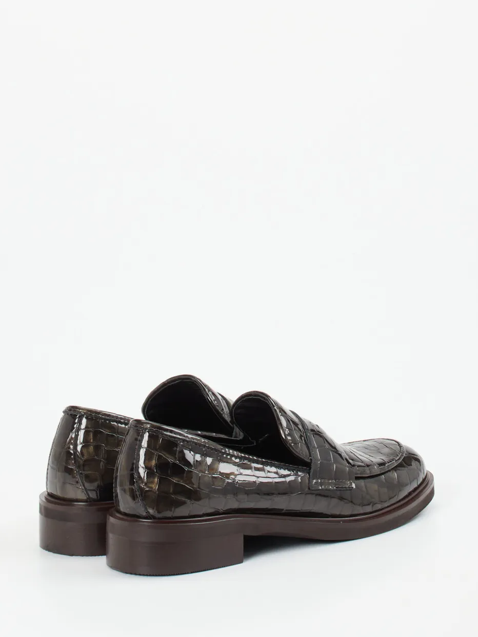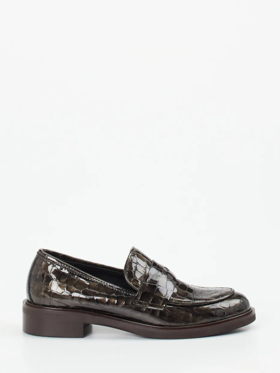 Das graugrüne Lackleder mit markanter Krokoprägung und glänzender Oberfläche bringt Stil in den „Quiet Luxury“-Trend. Die klassische Silhouette mit Schlupfform, toniger Gummisohle und leichtem Blockabsatz vereint femininen Anspruch mit alltagstauglichem Komfort. Feine Details wie Mokassinnaht und geschlitzter Loafer-Riegel sorgen für ein dezentes Designstatement. Eine ideale Ergänzung zu Feinstrick, Oversize-Blazern oder monochromen Outfits.