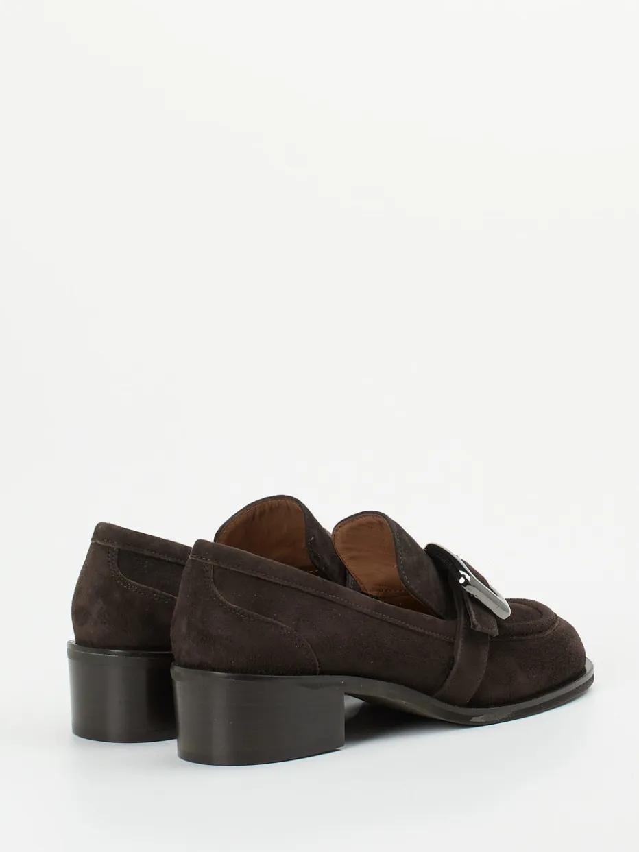 Für stilvolle Auftritte im Büro oder beim Spaziergang durch die Stadt bietet dieser dunkelbraune Velourslederschuh mit mattierter Oberfläche und dekorativer Schnalle aus Metall eine gelungene Mischung aus Komfort und Understatement. Der stabile Blockabsatz in Holz-Optik sowie die leicht eckige Kappe sorgen für eine ausgewogene Silhouette. Innen sorgt weiches Kalblederfutter in Cognac für angenehmes Tragegefühl. Stilistisch verbindet das Modell Retro-Anklänge mit einem modernen Quiet-Luxury-Charme. Besonders harmonisch in Kombination mit Kaschmirmantel und Lederhandtasche.