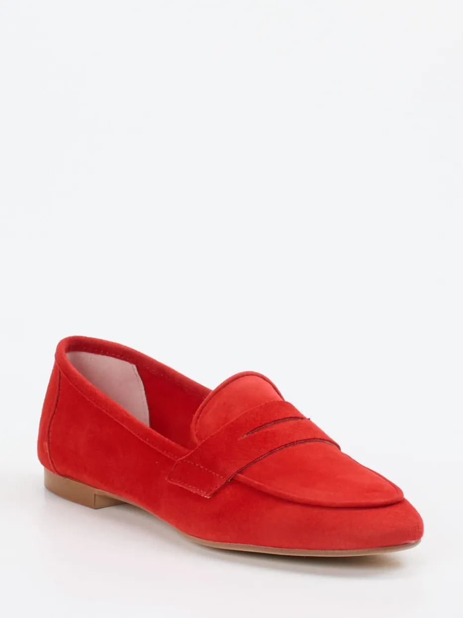 Der kirschrote Slipper überzeugt durch hochwertiges Veloursleder mit samtiger Haptik und einer klassischen, flachen Silhouette. Eine dezente Ziersteppung auf der Zunge, tonige Nähte und eine offene Bride betonen das minimalistische Design. Die gummierte Laufsohle sorgt für Flexibilität im Alltag, der niedrige 1 cm Blockabsatz bleibt dezent. Farblich ideal für angesagte Color-Blocking-Looks und moderne Kombinationen – etwa mit hellen Anzügen oder Jeans.