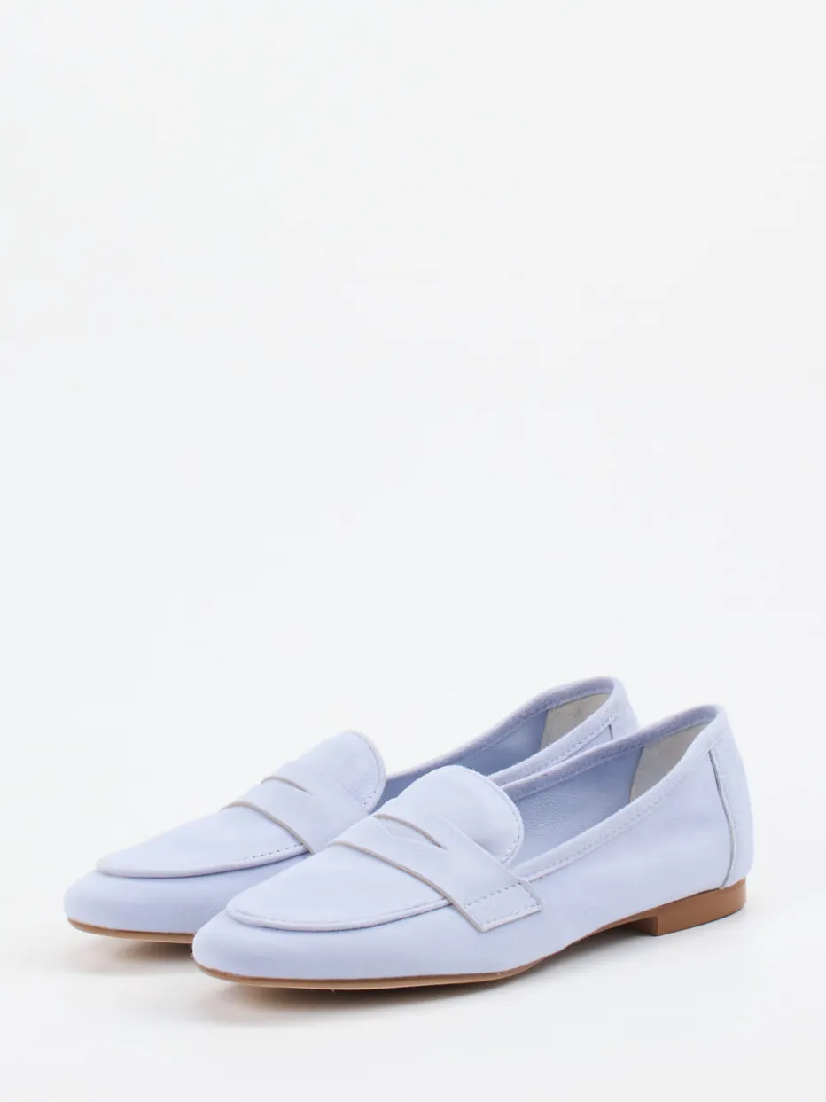Ideal für den Büroalltag oder den Stadtbummel: Das ungefütterte Veloursleder wirkt durch seine matte Oberfläche und die sanfte Pastellflieder-Färbung besonders edel. Die klassische, flache Silhouette mit offenkantiger Zierlasche und Ton-in-Ton-Nähten sorgt für einen dezenten Preppy Chic. Die farblich abgesetzte Gummisohle bietet angenehmen Laufkomfort, während leichte Prägungen am Fersenbereich für einen feinen Markenakzent stehen. Harmoniert besonders gut mit hellen Stoffhosen oder fließenden Röcken.