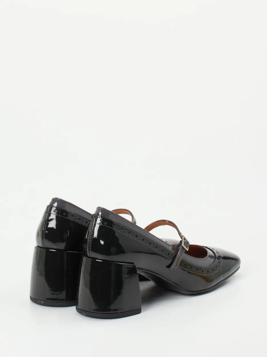 Andrea Puccini präsentiert mit diesen Damenpumps ein charakterstarkes Mary Jane Modell aus schwarzem Lackleder.