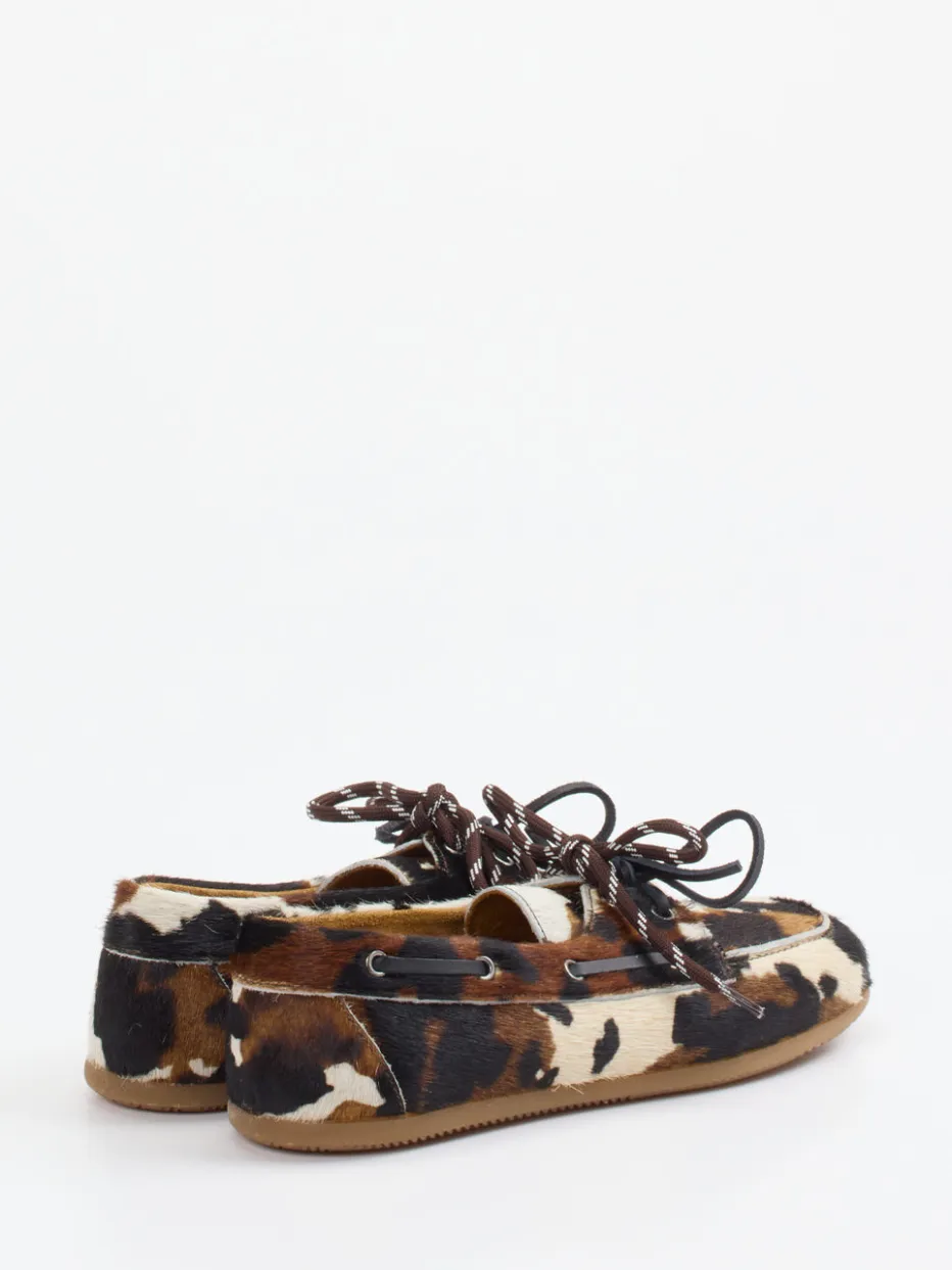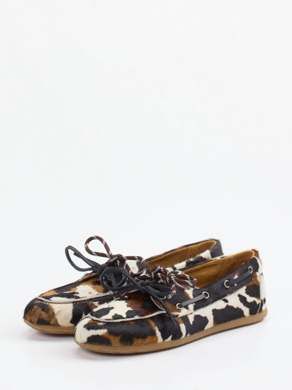 Design mit Charakter und Struktur.Andrea Puccini präsentiert einen Mokassin, der Lifestyle und Trendbewusstsein vereint. Für entspannte Stunden in der City oder auf Reisen verbindet dieser Damen-Mokassin einen klassischen Schnitt mit auffälliger Fellstruktur. Das hochwertige Fellimitat aus Kalbleder mit Haar in dunklem Braun und Beige trägt einen modernen Animal-Print, der spürbar strukturiert wirkt. Rundum-Schnürung mit silberfarbenen Ösen und zweifarbige Zierschleifen akzentuieren das Design. Die flache, honigfarbene Gummisohle sorgt für rutschhemmende Flexibilität. Inspiriert von Western-Ästhetik und 90s-Casuals, ideal für trendorientierte Looks. Ein femininer Statement-Schuh mit modischer Präzision – exklusiv von Andrea Puccini.