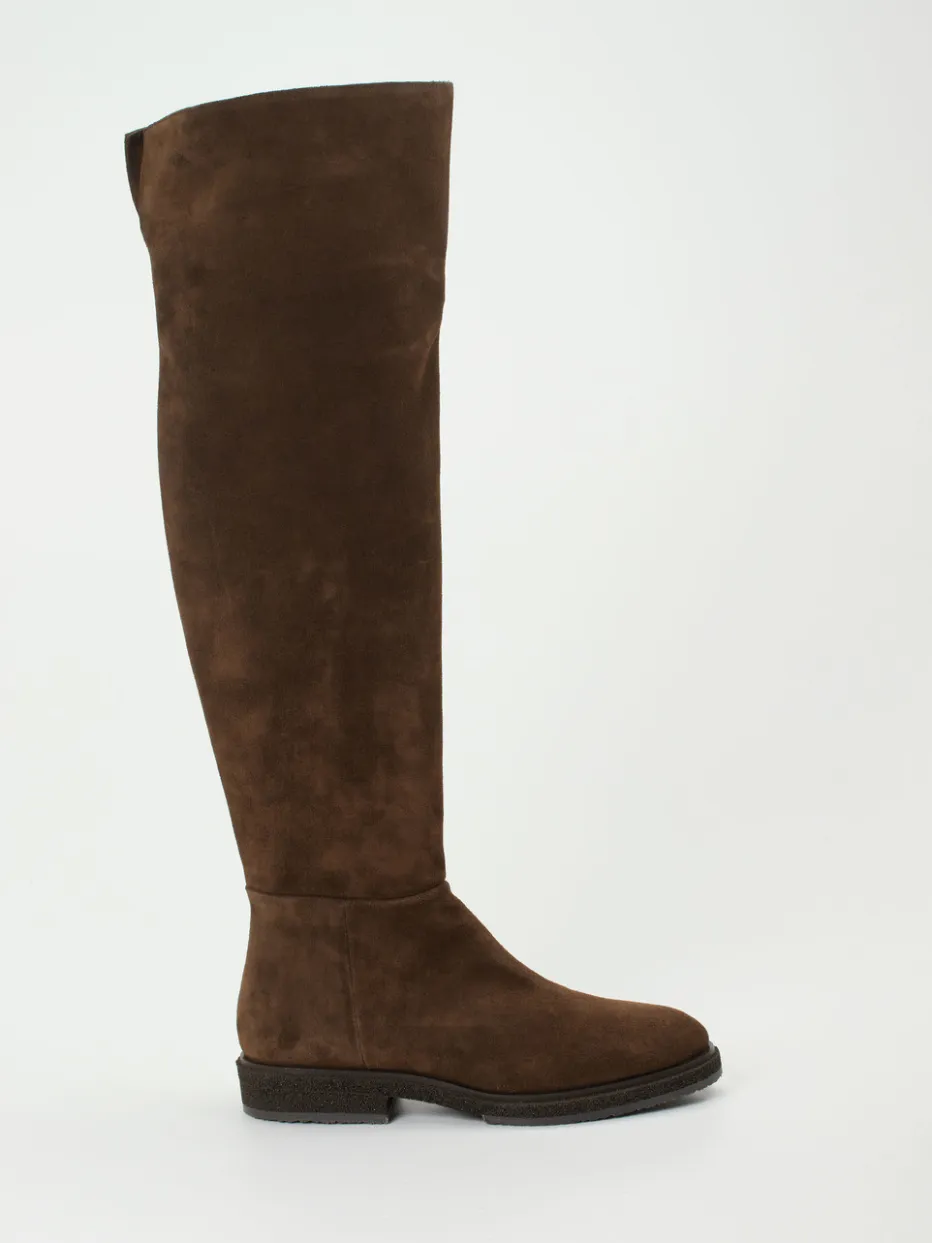 Ein charakterstarker Overknee-Stiefel mit minimalistischem Design, der durch samtiges Veloursleder und flache Profilsohle überzeugt – stilvoll für elegante Herbst-Winter-Looks.