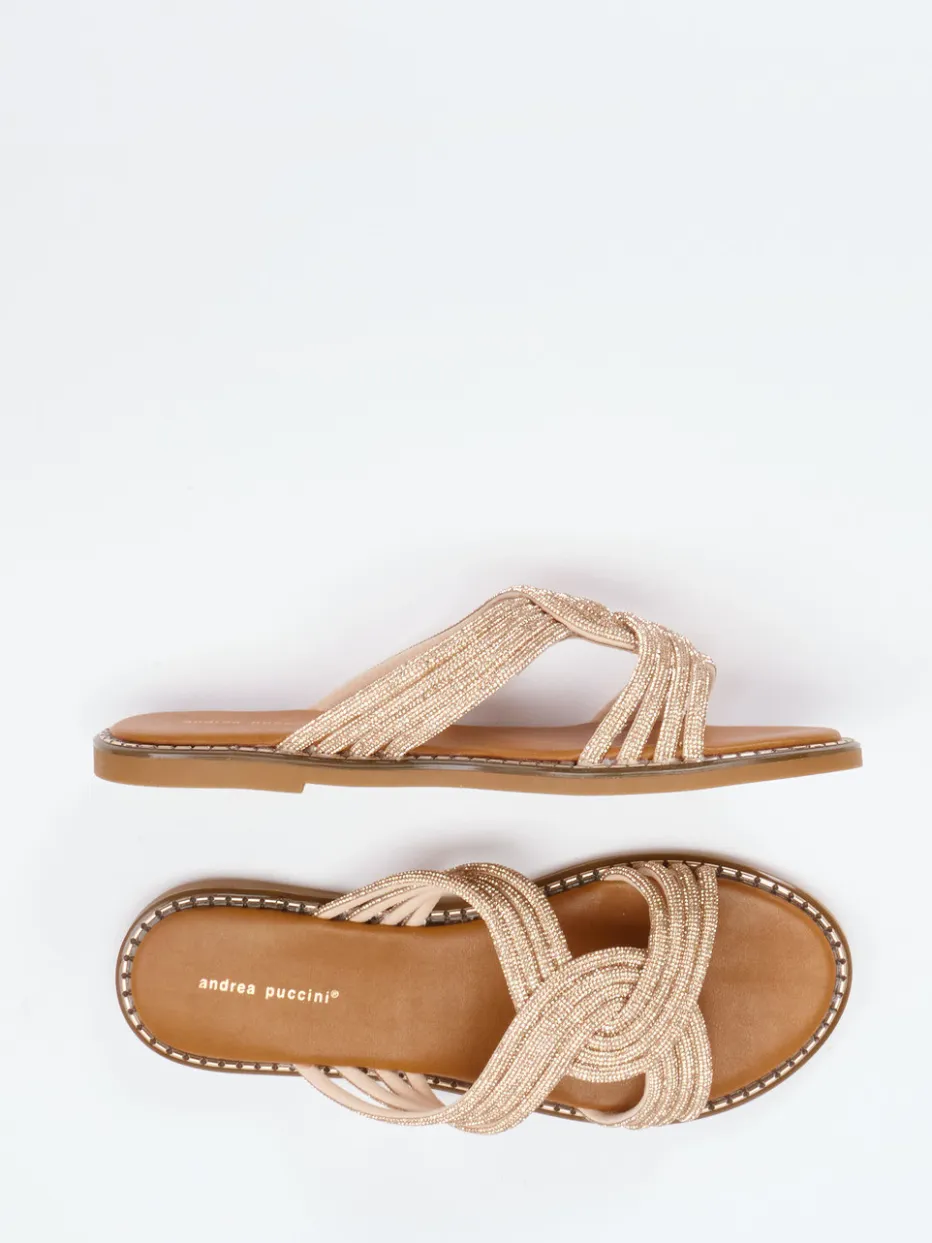 Schimmernder Auftritt mit femininer Raffinesse.Andrea Puccini präsentiert eine modische Damen-Pantolette mit dezentem Glamour. Für entspannte Urlaubstage oder sommerliche Cityspaziergänge bietet das Modell edlen Tragekomfort in glänzender Optik. Das hochwertige Obermaterial in Metallic vereint Flechtstruktur mit champagner-beigen Textilriemen, verziert mit zarten Strasssteinchen. Die flache Silhouette mit offenem Zehenbereich und gekreuzten Riemen liegt stilsicher im Resortwear-Trend. Die gepolsterte Innensohle erhöht den Komfort, während der Slip-on-Stil für müheloses Anziehen sorgt. In Kombination mit Maxikleidern oder Naturtönen entfaltet diese Pantolette ihre ganze Wirkung. Ein Design voller Leichtigkeit mit betont femininem Stilanspruch.