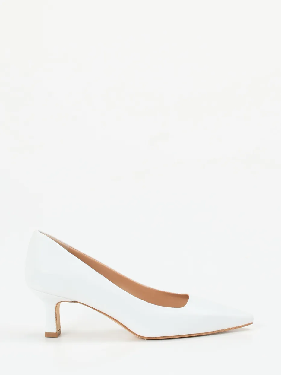 Stilvolle Zurückhaltung trifft auf femininen Chic.Andrea Puccini präsentiert mit diesem Pumps eine moderne Interpretation klassischer Eleganz. Ideal für Business-Termine oder elegante Events, überzeugt der Schuh mit edlem, weißem Ziegenleder in glänzender Ausführung. Die spitz zulaufende Form und der 5,5 cm hohe Kitten Heel verleihen dem Modell ein feminines Profil mit minimalistischem Charakter. Schlupfform, tonale Nahtdetails und eine gepolsterte Ledersohle runden das komfortable Tragegefühl ab. Typisch für den Trend „Quiet Luxury“ passt er hervorragend zu Etuikleidern oder monochromen Styles. Ein zeitloser Begleiter mit raffinierter Linienführung und hochwertiger Verarbeitung.