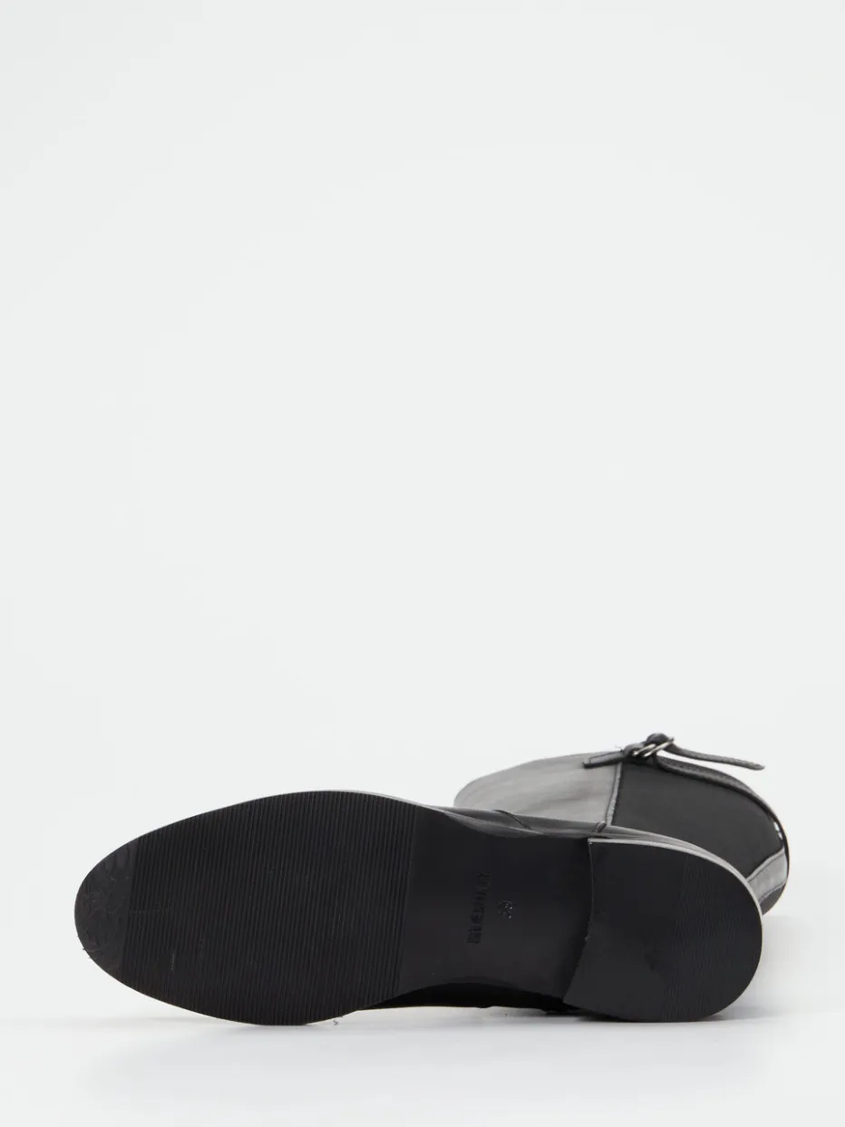 Schwarzer Klassiker für stilvolle Auftritte.Andrea Puccini präsentiert mit diesem Reitstiefel ein Modell für Damen, das klassische Eleganz mit funktionalem Design verbindet. Ideal für kühle Herbsttage im urbanen Alltag überzeugt der Stiefel durch hochwertiges Kalbleder mit elegantem Glanz und einen tonigen Stretch-Einsatz am Schaft, der optimalen Sitz bietet. Die Kombination aus schwarz glänzender Oberfläche, geradliniger Silhouette, silberfarbener Schnalle und praktischer Reißverschlusslösung macht ihn zum souveränen Begleiter für Business- und Freizeitlooks. Die robuste Gummisohle mit leichtem Absatz sorgt dabei für Trittsicherheit und Komfort. Ein stilvoller Reitstiefel mit zeitloser Silhouette – minimalistisch interpretiert für den modischen Alltag.