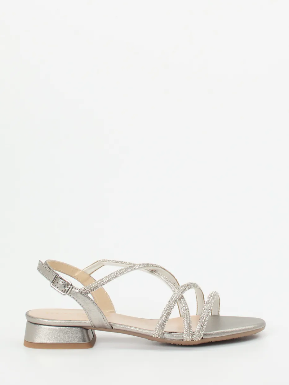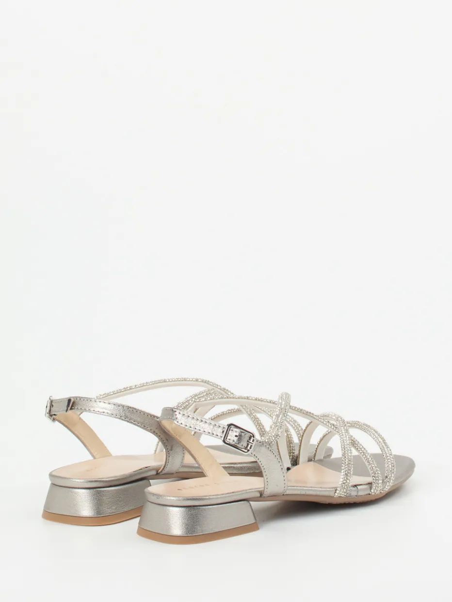 Elegant und funktional: Die silberne Riemchensandale von Andrea Puccini verbindet puristisches Design mit glitzernden Strassdetails – ein Highlight für formelle Anlässe.