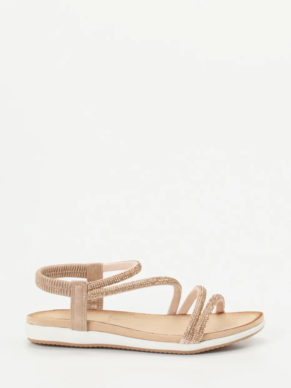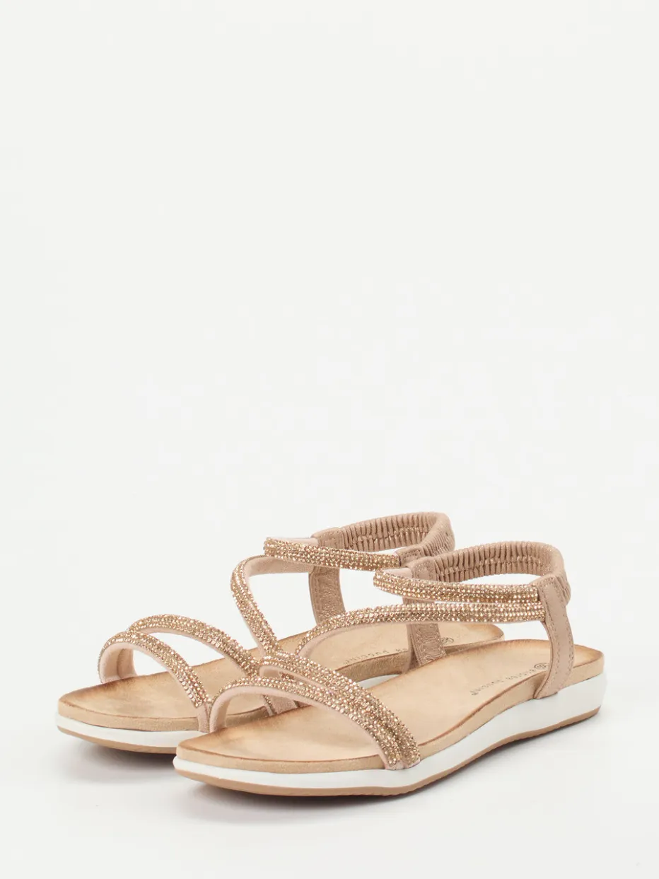 Ob beim Stadtbummel oder Urlaubsspaziergang – das altrosafarbene Metallicleder mit matter Oberfläche bringt in Kombination mit den Ton-in-Ton-Strassdetails dezenten Schimmer ins Outfit. Eine flache Silhouette, das weiche Fußbett und der elastische Fersenriemen garantieren Komfort bei jedem Schritt. Die profilierte Gummisohle sorgt dabei für Trittsicherheit. Als stilvolle Ergänzung zu leichten Sommerkleidern oder hellen Leinenhosen betont sie einen casual-chicen Stil.