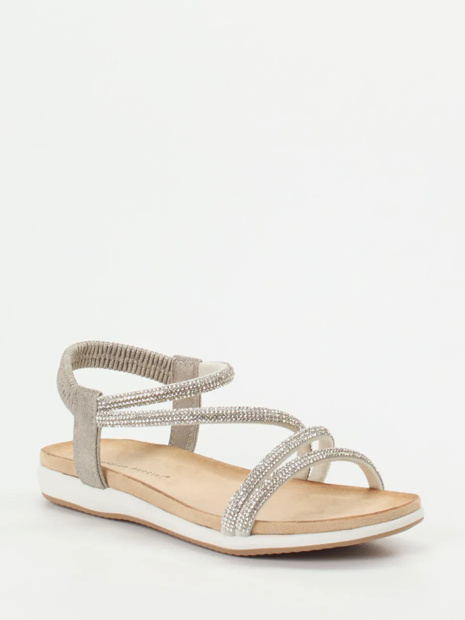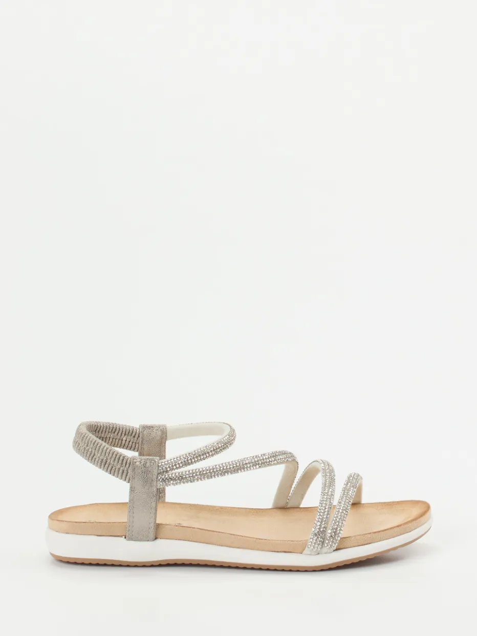 Strahlend leicht durch den Sommer.Andrea Puccini präsentiert elegante Riemchensandalen für Damen mit glänzender Ausstrahlung. Für laue Abende auf der Terrasse oder entspannte Urlaubstage bietet das silberfarbene Metallicleder mit feinem Strassbesatz einen stilvollen Auftritt. Die mehrfach überkreuzten Riemen und der elastische Fersenriemen sorgen für sicheren Halt, während das weich gepolsterte Fußbett in Kombination mit der flachen, gummierten Laufsohle angenehmen Komfort verspricht. Der champagnerfarbene Grundton unterstreicht den dezenten Glanz, der aktuell zum Trendthema „Quiet Luxury“ passt. Stilvoll zu leichten Sommerkleidern und metallicfarbenen Accessoires. Hochwertiger Sommerschuh mit funkelndem Detailanspruch im typischen Andrea-Puccini-Stil.