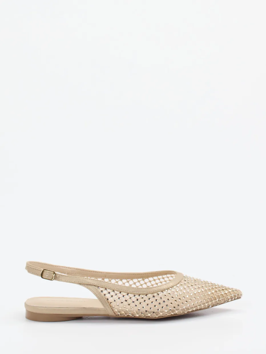 Sommerleicht und trendbewusst.Andrea Puccini bringt mit diesen Slingback-Ballerinas ein Modell auf den Punkt, das Transparenz und Eleganz raffiniert kombiniert. Ideal für festliche Anlässe oder stilvolle Alltagsmomente bieten diese Ballerinas ein luftiges Tragegefühl bei maximalem Chic. Das champagnerbeige Netzgewebe mit feiner Metallic-Note sorgt für Leichtigkeit und visuelle Tiefe, während die spitz zulaufende Silhouette und die goldfarbene Schließe an der Ferse modische Akzente setzen. Die flache Gummisohle mit Rutschhemmung verspricht Komfort in Bewegung. Inspiriert von „Quiet Luxury“ und Transparenztrends der Saison, sind sie das perfekte Finish zu edlen Stoffhosen oder zarten Sommerkleidern. Ein stilvolles Design, das Leichtigkeit und Eleganz subtil vereint.