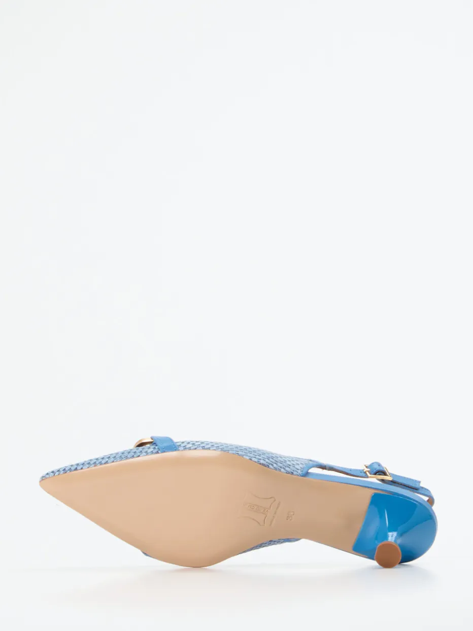 Feines Flechtwerk mit italienischem Akzent.Andrea Puccini interpretiert klassischen Damenschuh-Stil mit sommerlicher Eleganz in dieser Variante moderner Slingback-Pumps. Die spitz zulaufende Form in Himmelblau kombiniert hochwertige Materialien: Geflochtenes Basttextil mit matter Oberfläche trifft auf ein Futter aus weichem Lammnappa. Der individuell verstellbare Fersenriemen mündet in eine goldfarbene Schnalle mit Bambusdetail – ein dezenter Hinweis auf Naturverbundenheit und den Quiet-Luxury-Trend. Der 5,5 cm hohe Kitten Heel unterstreicht den eleganten Anspruch dieses Schuhs. Ideal zu Leinen-Ensembles oder fließenden Stoffen. Ein feminines Statementstück mit stilvollem Retro-Charme und handwerklichem Detailfokus.