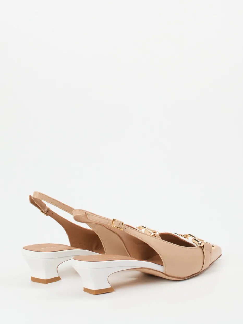 Eleganz und Zurückhaltung prägen das Design dieser Slingback-Pumps aus weichem Lammleder. Feine Details wie die goldene Schnalle und der zweifarbige Absatz setzen stilvolle Akzente.