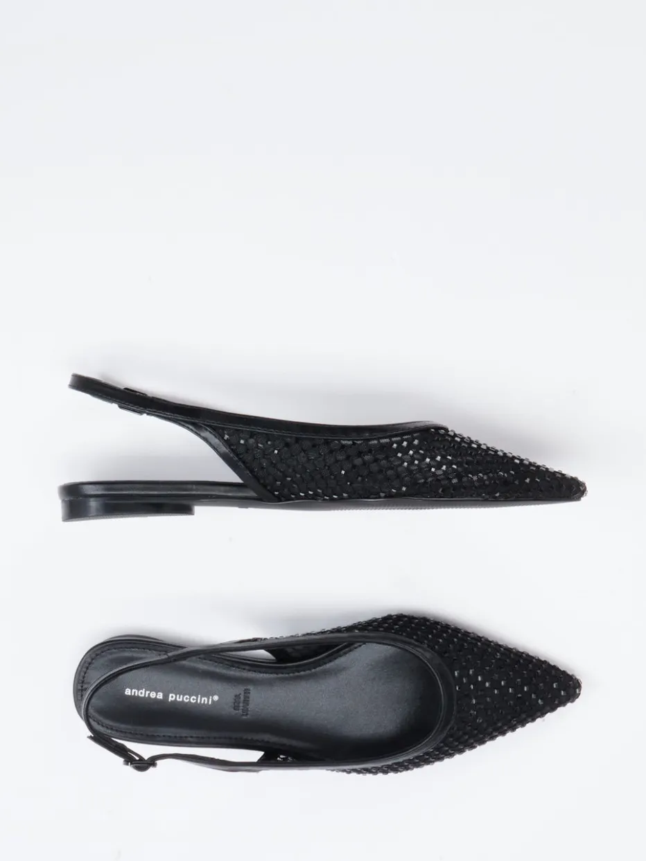 Sommerleicht und stilbewusst.Andrea Puccini präsentiert diesen Damen-Slingpumps mit luftigem Netzgewebe. Ideal für urbane Sommerabende vereint das Modell atmungsaktives schwarzes Netzmaterial mit halbtransparenter Struktur und tonigen Glanzakzenten. Die spitze Form und der verstellbare Fersenriemen sorgen für stilbewusstes Design und einen sicheren Sitz. Eine flache Gummisohle und das gepolsterte Fußbett bieten Alltagstauglichkeit, während der Look Einflüsse des Quiet Luxury und Mesh-Revivals aufgreift. Perfekt zu Leinenhosen oder Metallic-Accessoires kombinierbar. Elegante Leichtigkeit trifft auf modische Raffinesse à la Andrea Puccini.