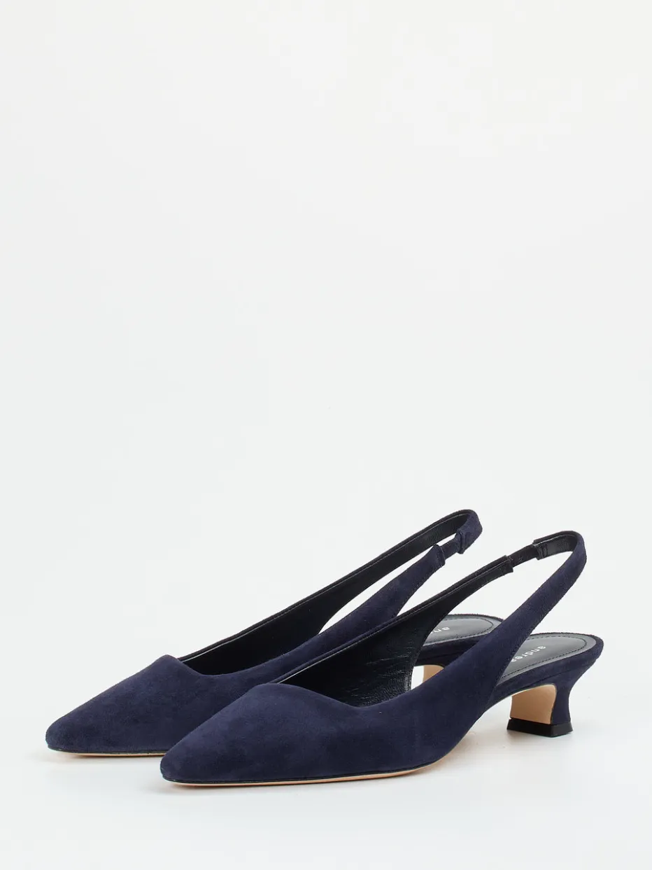 Ob für wichtige Meetings oder festliche Einladungen – das dunkelblaue Veloursleder mit samtig matter Oberfläche passt perfekt zu formellen Anlässen. Der spitz zulaufende Leisten mit asymmetrischem Dekolleté harmoniert mit dem bezogenen Kitten Heel und unterstreicht die schlanke Silhouette. Der elastische Slingback-Riemen bietet angenehmen Halt, während das weiche Kalblederfutter und die gepolsterte Ledersohle für Komfort sorgen. Modisch orientiert sich das Modell an den 1990er-Jahre-Vibes und greift den Trend „Quiet Luxury“ auf. Stilvoll kombinierbar mit einem Blazer oder einer Leder-Clutch.