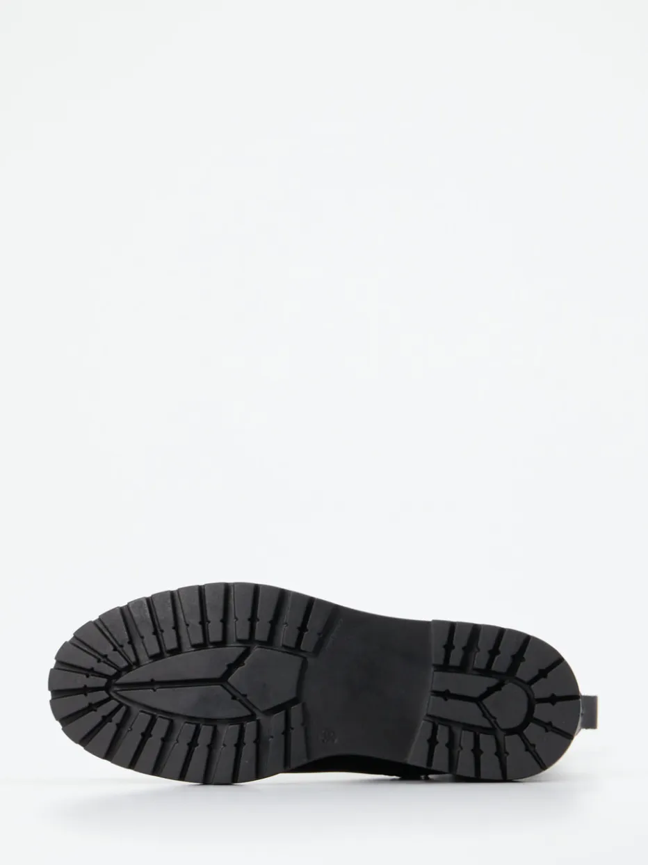 Schwarzes Kalbleder und goldfarbene Hardware verleihen dieser Stiefelette einen urban-expressiven Look mit hochwertigem Finish. Die robuste Gummisohle unterstreicht den Streetwear-Charakter.