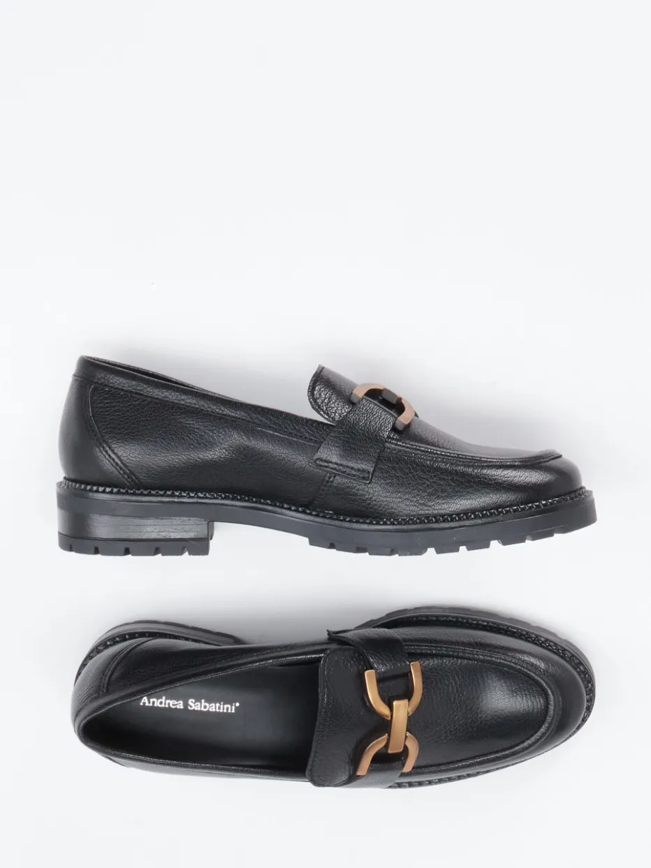 Moderner Klassiker mit feinem Detail.Andrea Sabatini präsentiert mit diesem schwarzen Damen-Loafer ein formbetontes Modell für Alltag und Büro. Der hochwertige Halbschuh aus genarbtem Ziegenleder verbindet klassischen Stil mit modischer Aussage. Die flache Passform, der spitz zulaufende Leisten und die bronzefarbene Metallspange vorne setzen elegante Akzente. Die robuste Gummisohle mit Blockabsatz bietet guten Halt und folgt dem Chunky-Loafer-Trend. Dezente Nähte strukturieren das Design zusätzlich. Stilistisch überzeugt dieser Loafer komfortaffine wie klassische Trägerinnen. Komfort, Stiltreue und Lederqualität – markentypisch vereint.