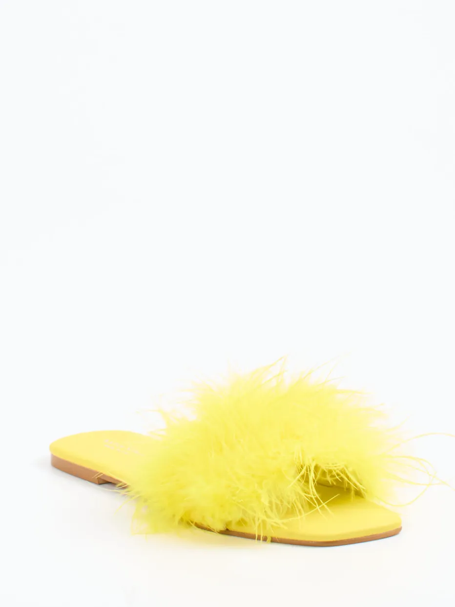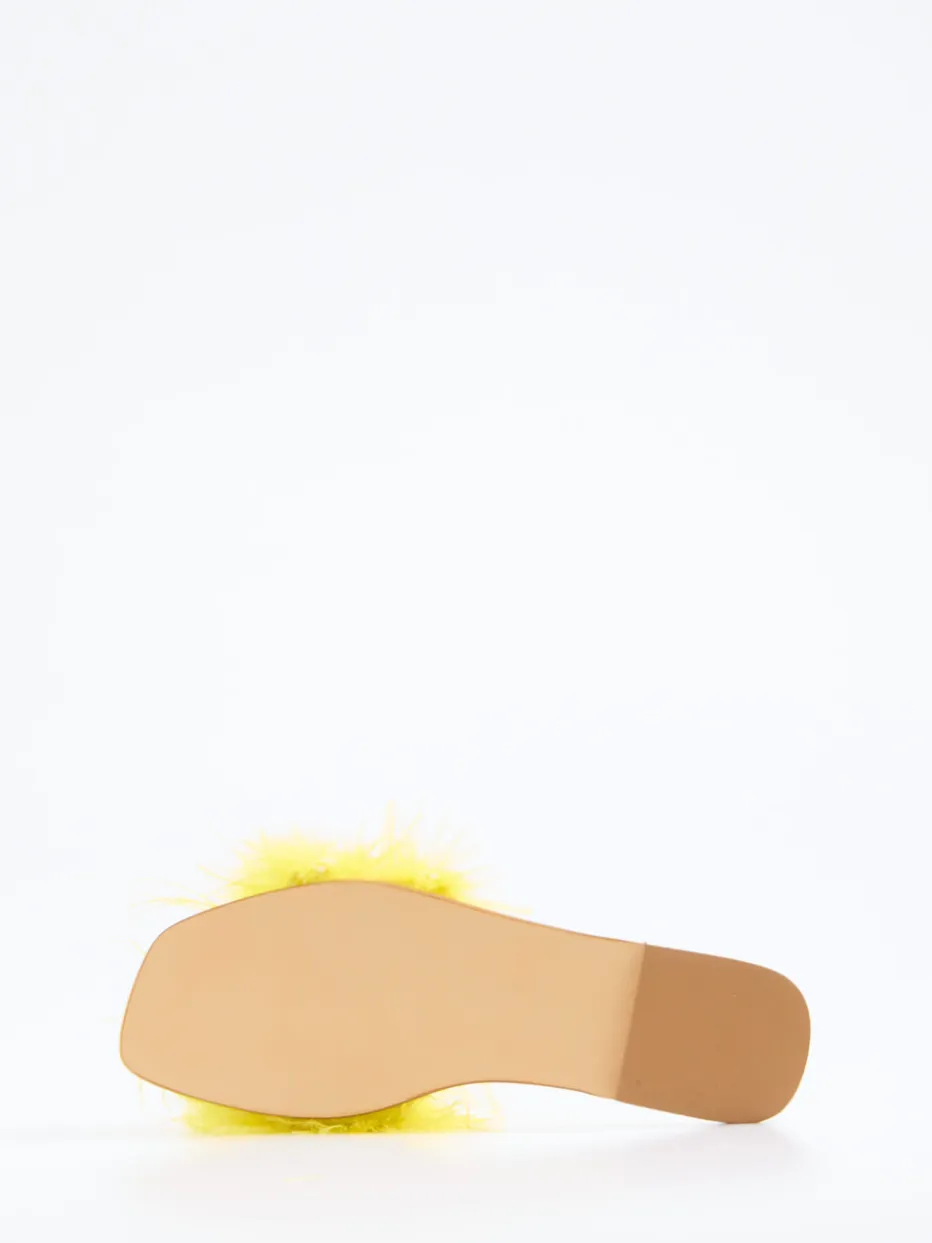 Federn, Farbe, Fashion.Andrea Sabatini präsentiert mit dieser Damen-Slide ein Fashion-Highlight der Saison. Ideal für gesellige Sommerabende oder entspannte Lounge-Momente – die flache Pantolette mit federbesetztem Riemen zieht mit ihrem intensiven Neongelb alle Blicke auf sich. Aus Fell gefertigt und mit auffälligem Ton-in-Ton-Federbesatz veredelt, entsteht eine luxuriöse, matte Textur mit voluminösem Effekt. Die offene Silhouette mit eckiger Zehenpartie steht für modischen Zeitgeist, inspiriert von Y2K-Ästhetik und „Feather Details“-Trend. Kombiniert mit Seidenkimono oder Metallic-Tasche wird der Look komplett. Ein leichtes Statement-Piece mit markentypischer Extravaganz.