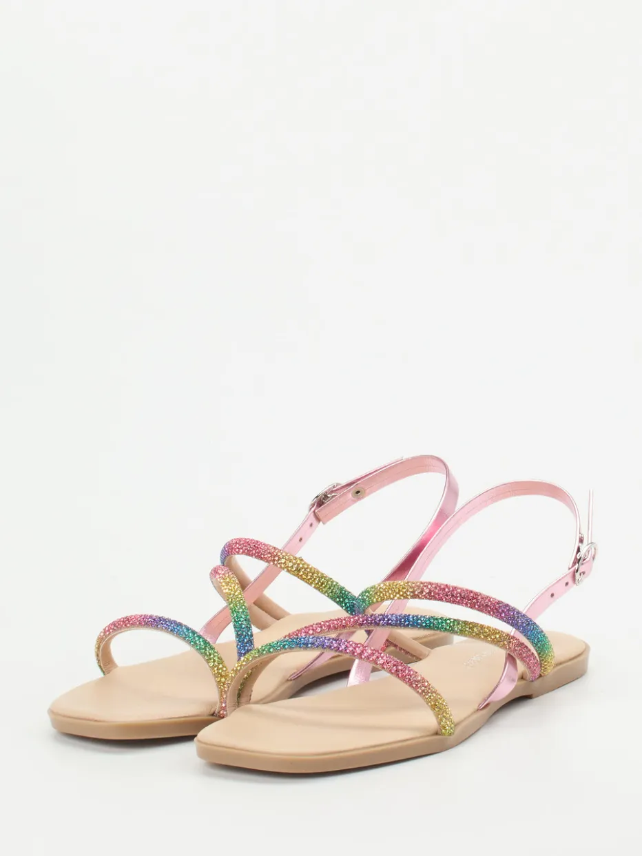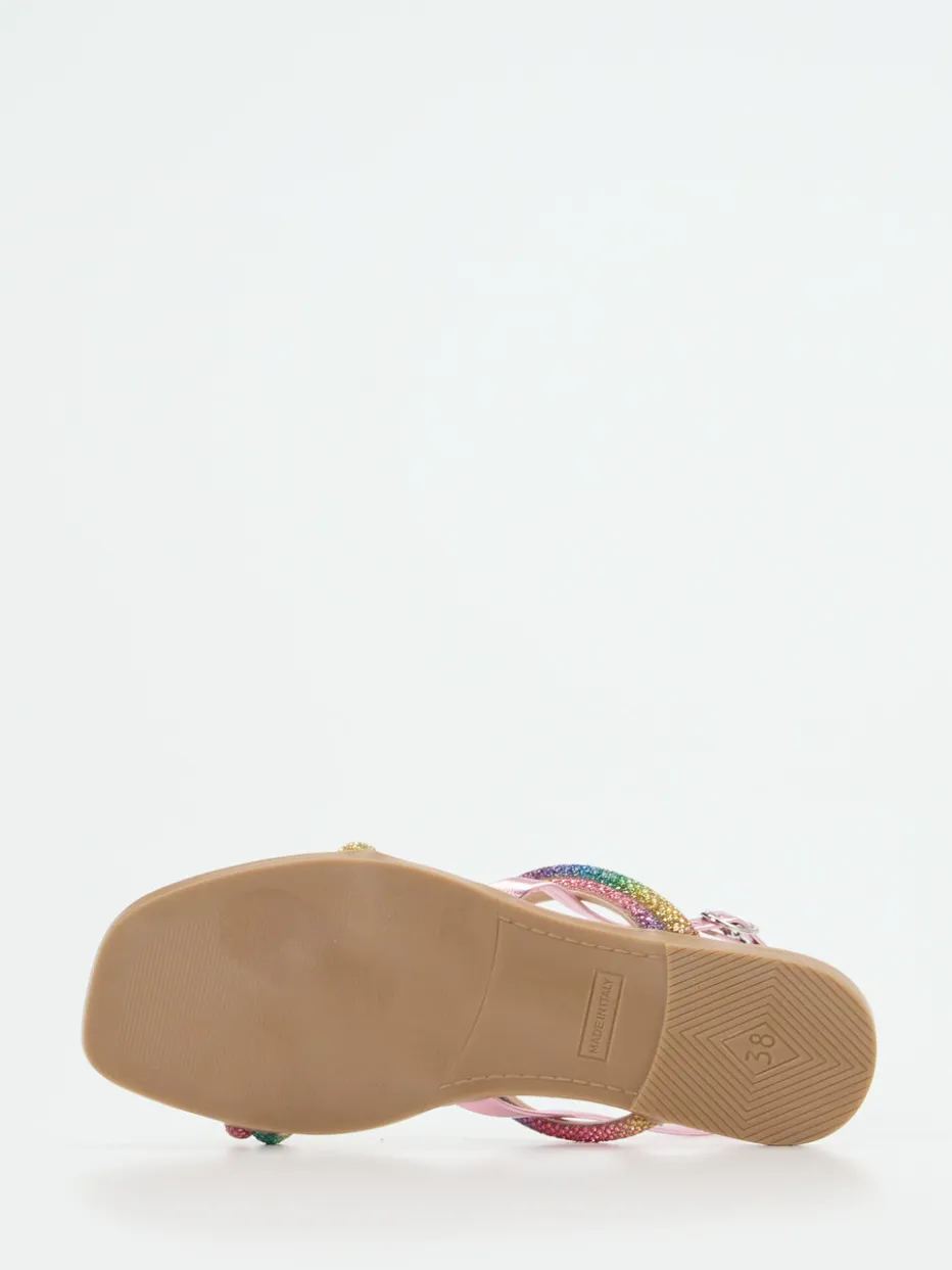 Glanzstück für warme Tage.Andrea Sabatini präsentiert mit dieser Damen-Zehentrenner-Sandale ein Modell, das Sommerflair und Trendbewusstsein vereint. Ideal für Festivalbesuche, Urlaubsabende oder entspannte City-Tage: Das schimmernde Metallicleder ist mit einem Multicolor-Strassbesatz veredelt und verleiht dem Schuh seinen glamourösen Charakter. Rosa-metallische Riemen, ein verstellbarer Fersenriemen und die flache, flexible Kunststoffsohle mit leicht gepolstertem Fußbett bieten Komfort und sicheren Halt. Dank des Y2K-inspirierten Designs und der angesagten Rainbow-Akzente fügt sich die Sandale stilvoll in aktuelle Trendbilder ein. Besonders gut kombinierbar mit pastelligen Kleidern oder farbigen Accessoires. Ein multicolor Hingucker für modeaffine Sommermomente.