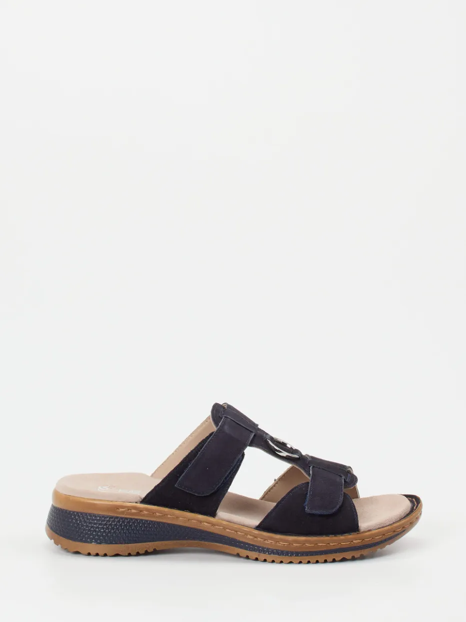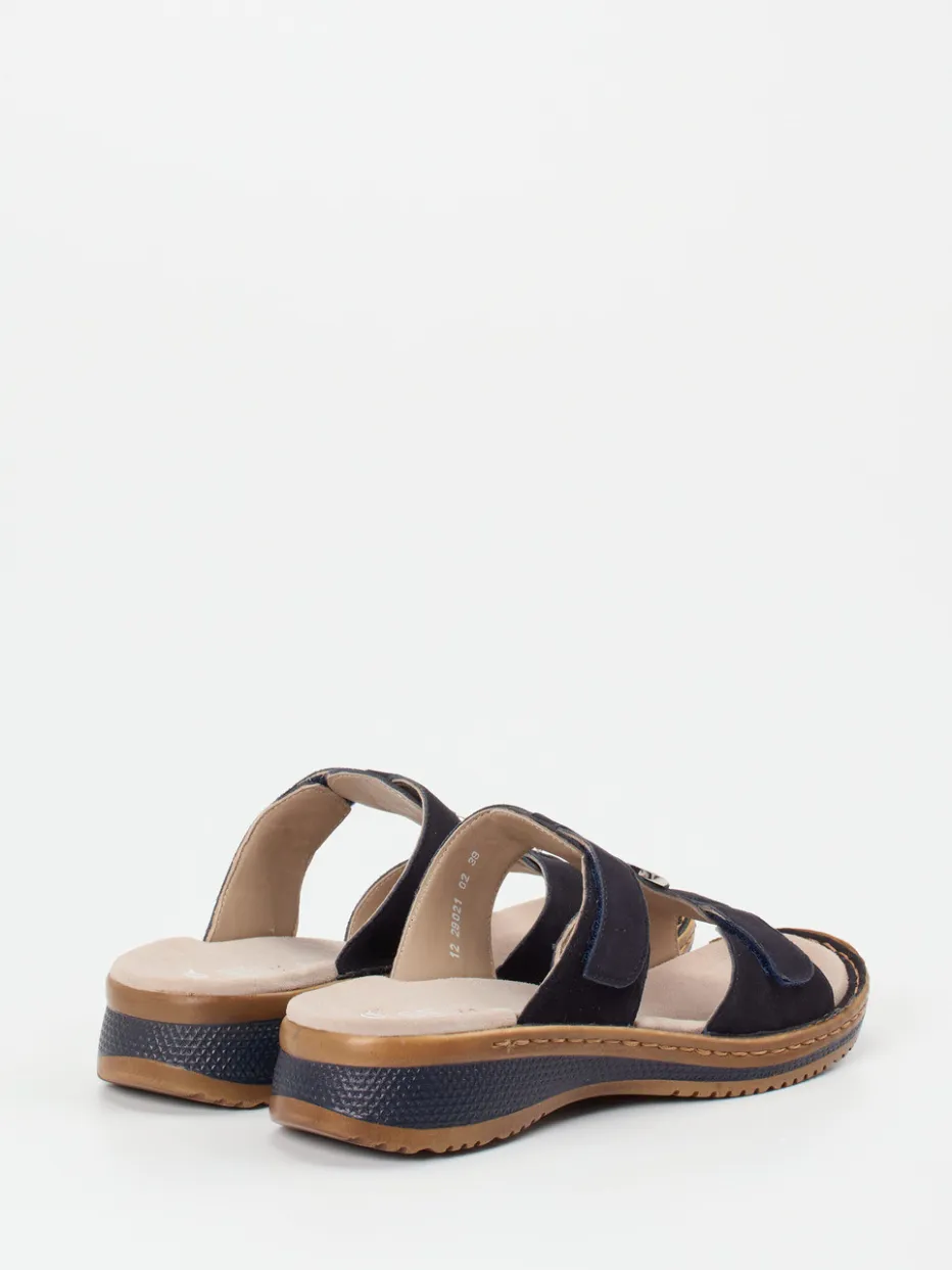 Die dunkelblaue Pantolette aus samtig angeschliffenem Veloursleder bietet dank gepolstertem High-Soft-Fußbett und Klettverschlüssen eine flexible Passform und angenehmen Halt. Die offene, ergonomisch geformte Silhouette wird durch einen silberfarbenen Metallring und kontrastierende Ziernähte dezent akzentuiert. Eine griffige PU-Sohle sorgt für rutschfeste Trittsicherheit. Ideal für die Sommergarderobe und stilvoll kombinierbar mit Leinen oder Denim.