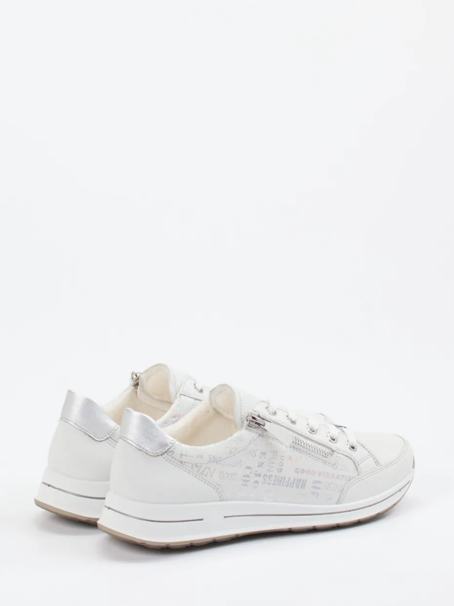 Leicht, modern und voller Komfort.Ara präsentiert einen Damen-Sneaker, der in Sachen Tragekomfort wie auch Design neue Maßstäbe setzt. Für entspannte Tage in der Stadt oder auf Reisen verbindet dieser Komfort-Sneaker aus geprägtem Leder mit genarbter Struktur modernes Stilgefühl mit dem bewährten Komfort der HighSoft-Sohle. Das Offwhite-Farbspiel mit silberfarbenen Akzenten und schimmerndem Schriftprint unterstreicht die luftige, urbane Ausstrahlung. Reißverschluss und Schnürung sorgen für flexiblen Einstieg, das atmungsaktive Frottee-Fußbett ist herausnehmbar. Die abgerundete Form ergänzt den sportiv-femininen Look. Optimal zu hellen Denim-Looks oder leichten Sommerjacken. Ein vielseitiger Alltagsbegleiter mit der charakteristischen Ara-Leichtfüßigkeit.